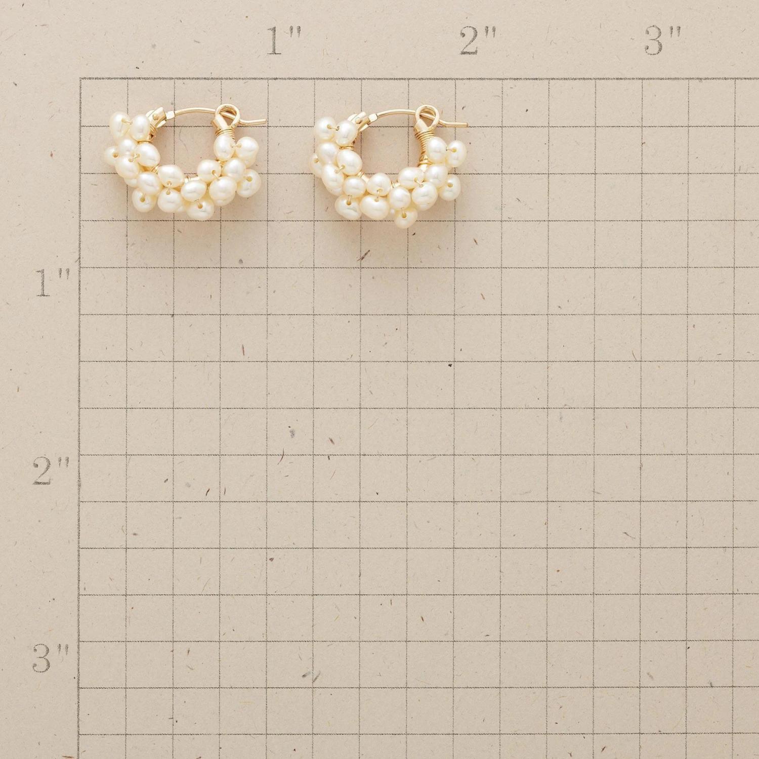 A pair of wired hoop earrings, with little cultured pearls enveloping 14kt gold filled hoops in a luminous froth. The gems are wired by hand; the earrings finished with snap down wires. Made in USA. 5/8″L.