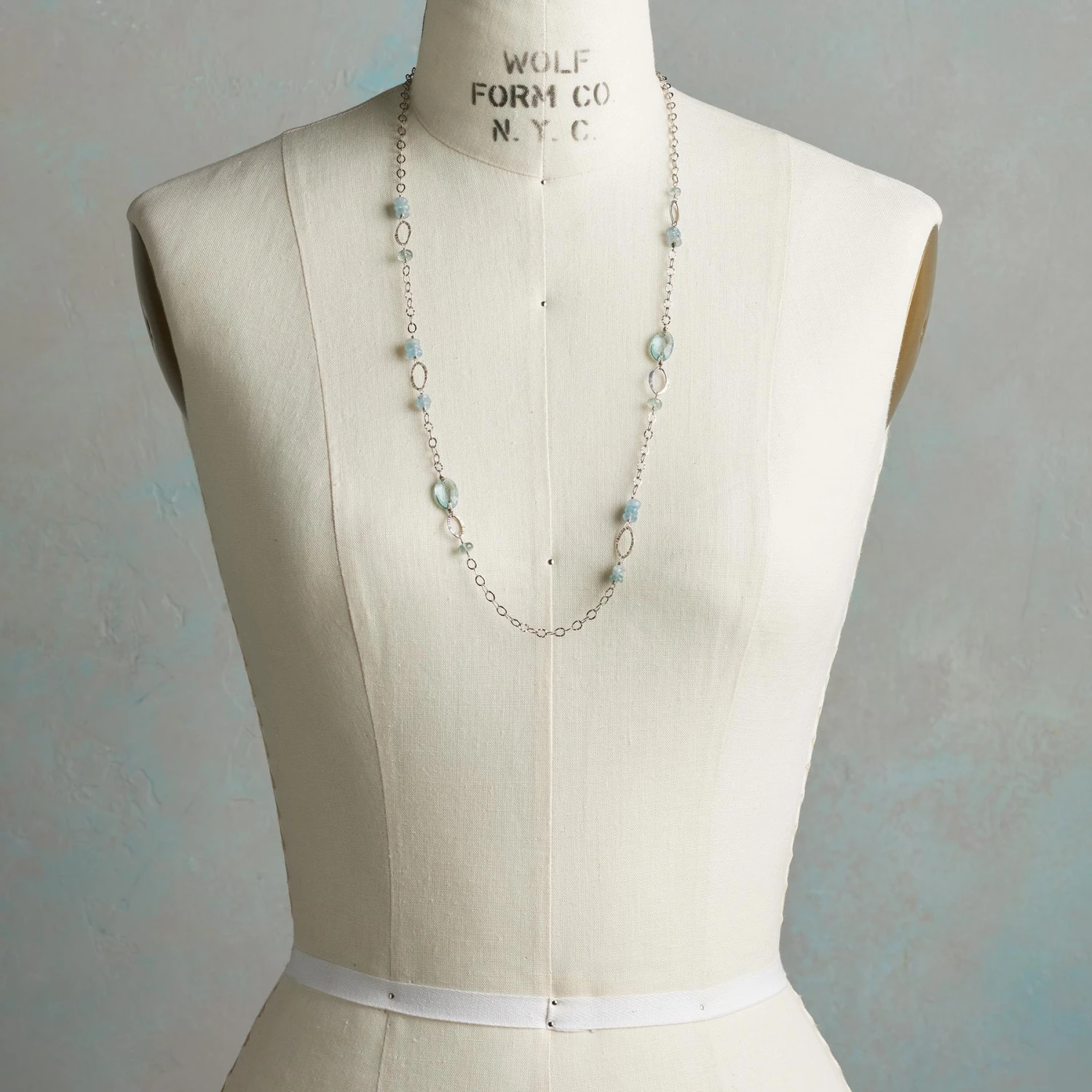 Slender sterling silver links and hand-hammered ovals are artfully interspersed with moments of kyanite, quartz and mossy-hued aquamarine, in this long, lovey necklace. Sterling lobster clasp. Made in USA by Dana Kellin. Exclusive. 28″L.