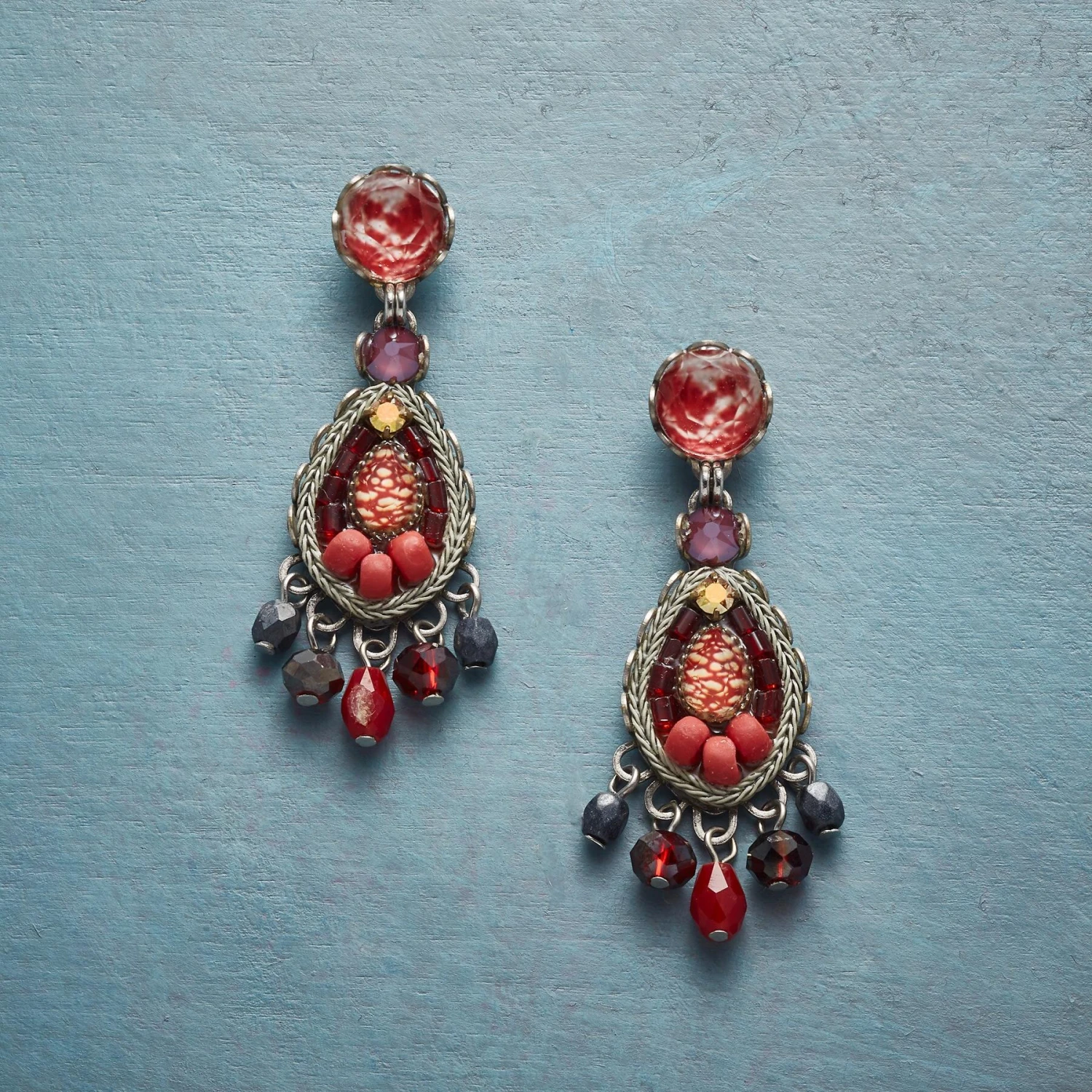 A study in shades of the heart with cut crystal, glass and ceramic beads and printed art paper intricately handcrafted. Posts. Nickel-free, silver-plated metal. Exclusive. Approx. 1-1/2″L.