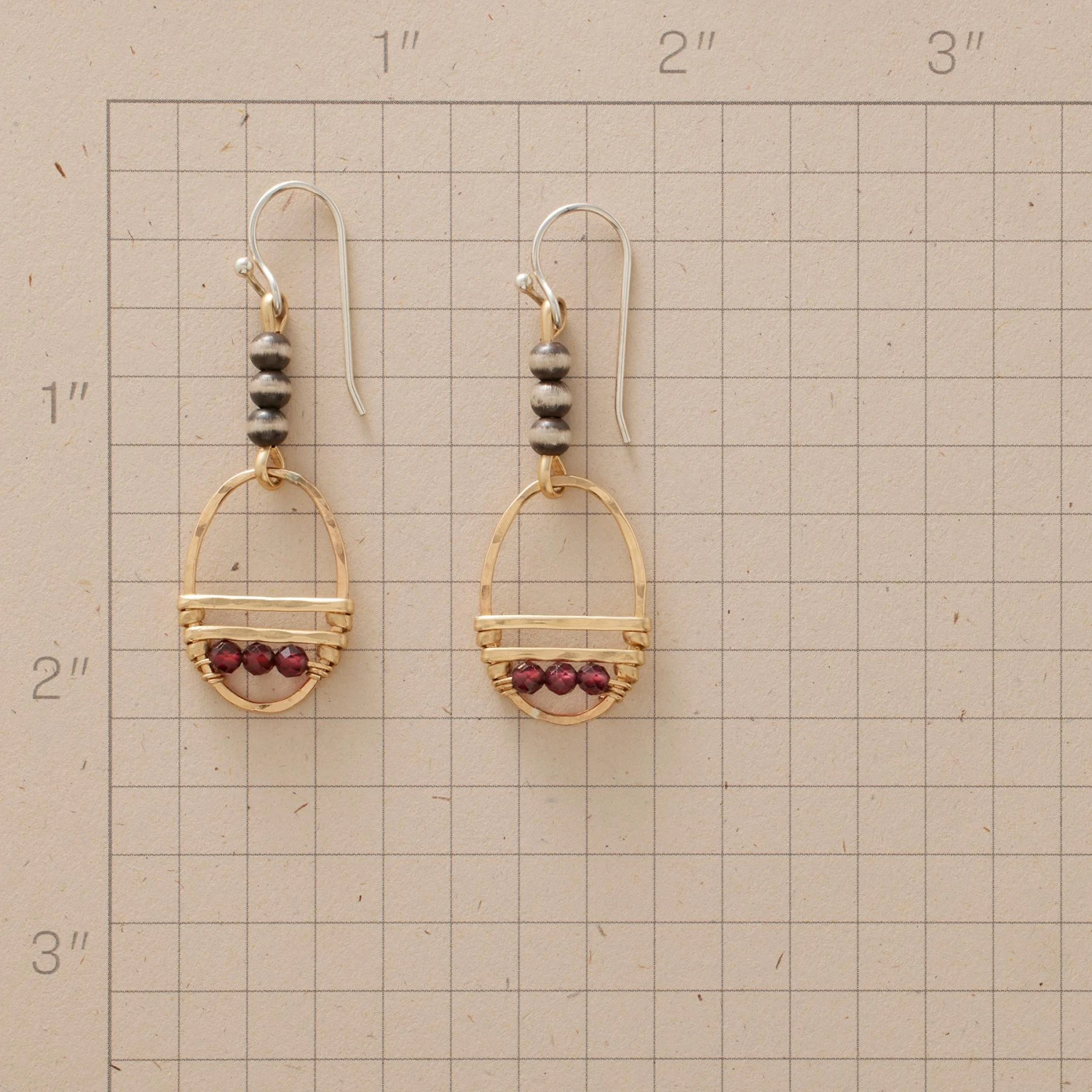 Garnets line up in threes within airy armatures of 14kt gold-filled wire, slung beneath stacks of sterling silver beads. Sterling silver French wires. Handmade in USA. Exclusive. 2″L.