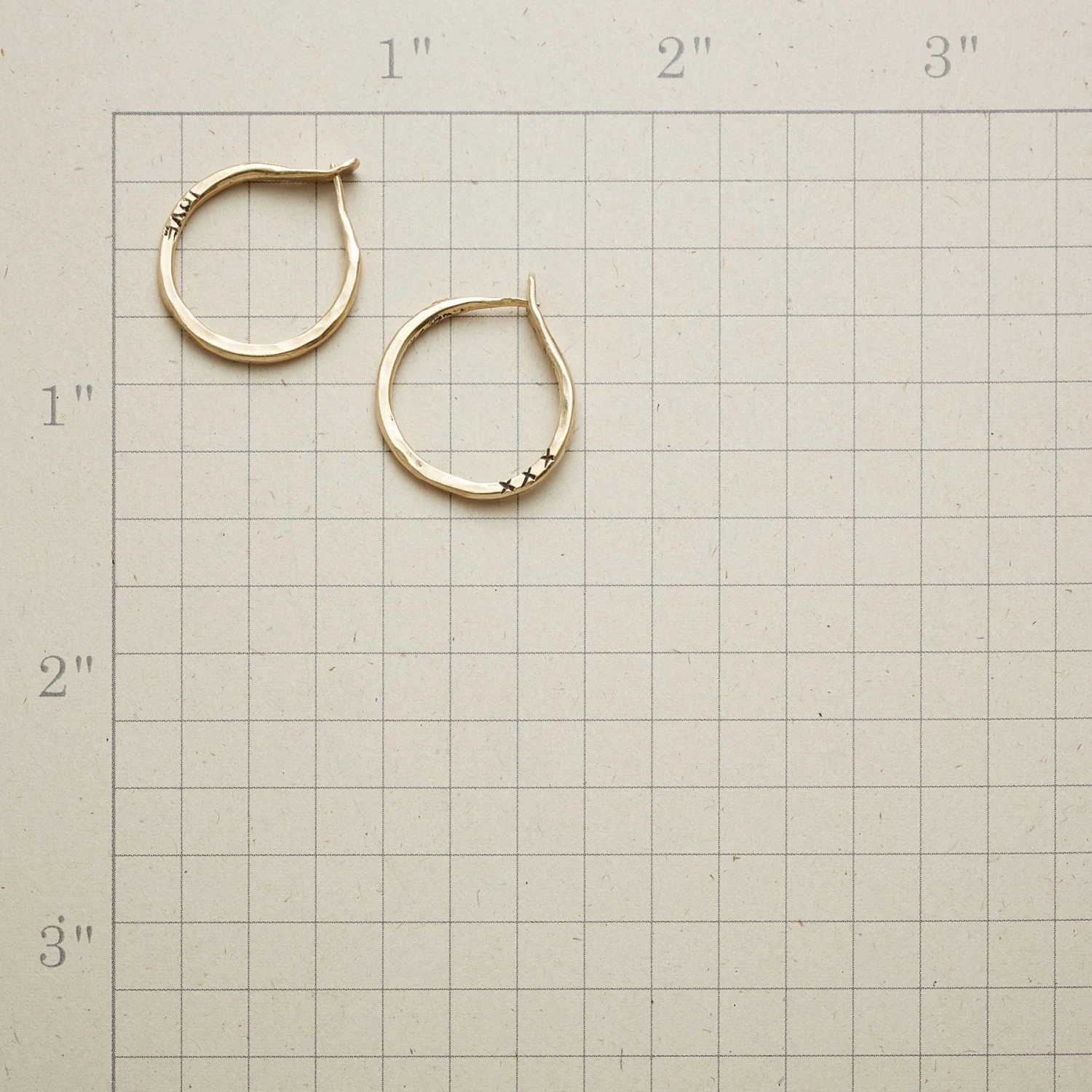 Hoops to wear every day, handcrafted of 14kt gold, rippling with light and etched with messages of love. Self-locking. Handcrafted by Jes MaHarry in the USA. 3/4″ dia.