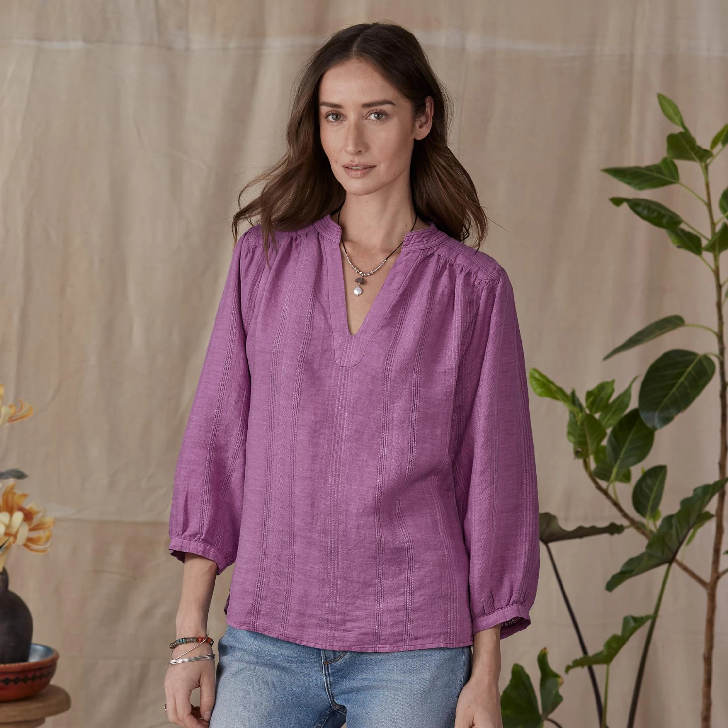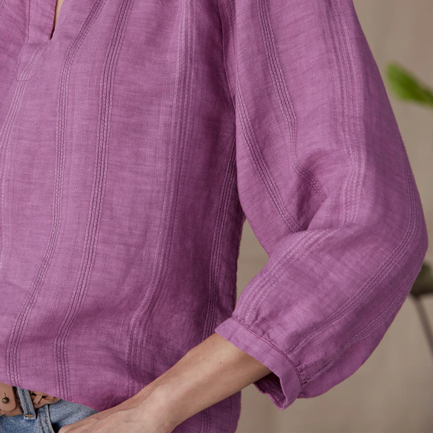 This light and airy tunic proves there is beauty in simplicity, with subtle, tonal stripes; notch neckline, and hi-lo hem. Linen. Machine wash. Imported. Sizes XS (0 to 2), S (4 to 6), M (8 to 10), L (12 to 14), XL (16 to 18), XXL (20 to 22). Approx. 25-3/4″L.