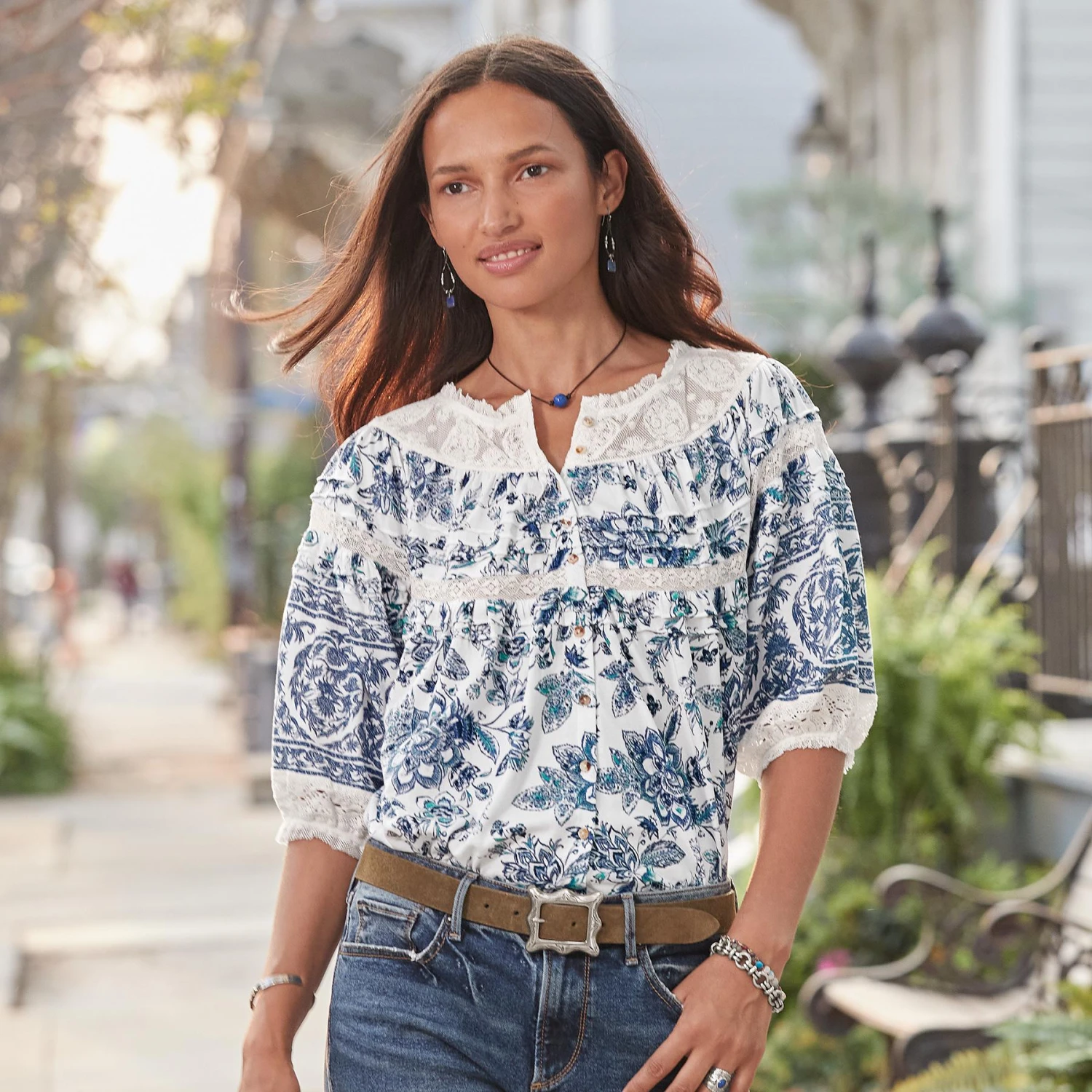 Soft, mixed print patterns with printed borders are enhanced with embroidered mesh and lace insets on our easy fit top with raw edge details, pin tucks and shell buttons. Full elbow length sleeves. Cotton/modal. Machine wash. Imported. Exclusive. Sizes XS (0–2), S (4–6), M (8–10), L (12–14), XL (16–18), XXL (20–22). Approx. 25″l.