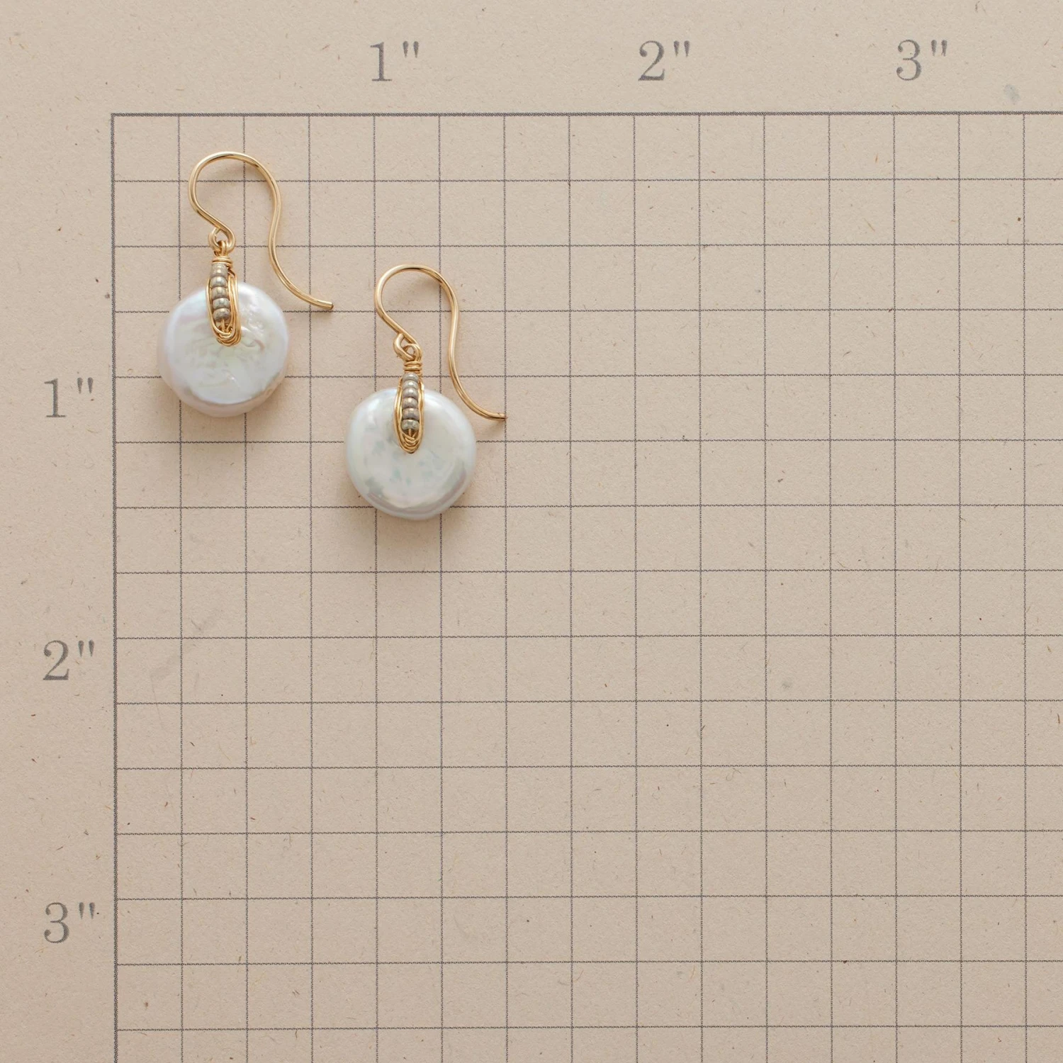 Buttons of freshwater pearl are accented with petite seed pearls and intricate wire wrapping in Dana Kellin’s handcrafted 14kt gold-filled earrings. French wires. Made in USA. 1″L.