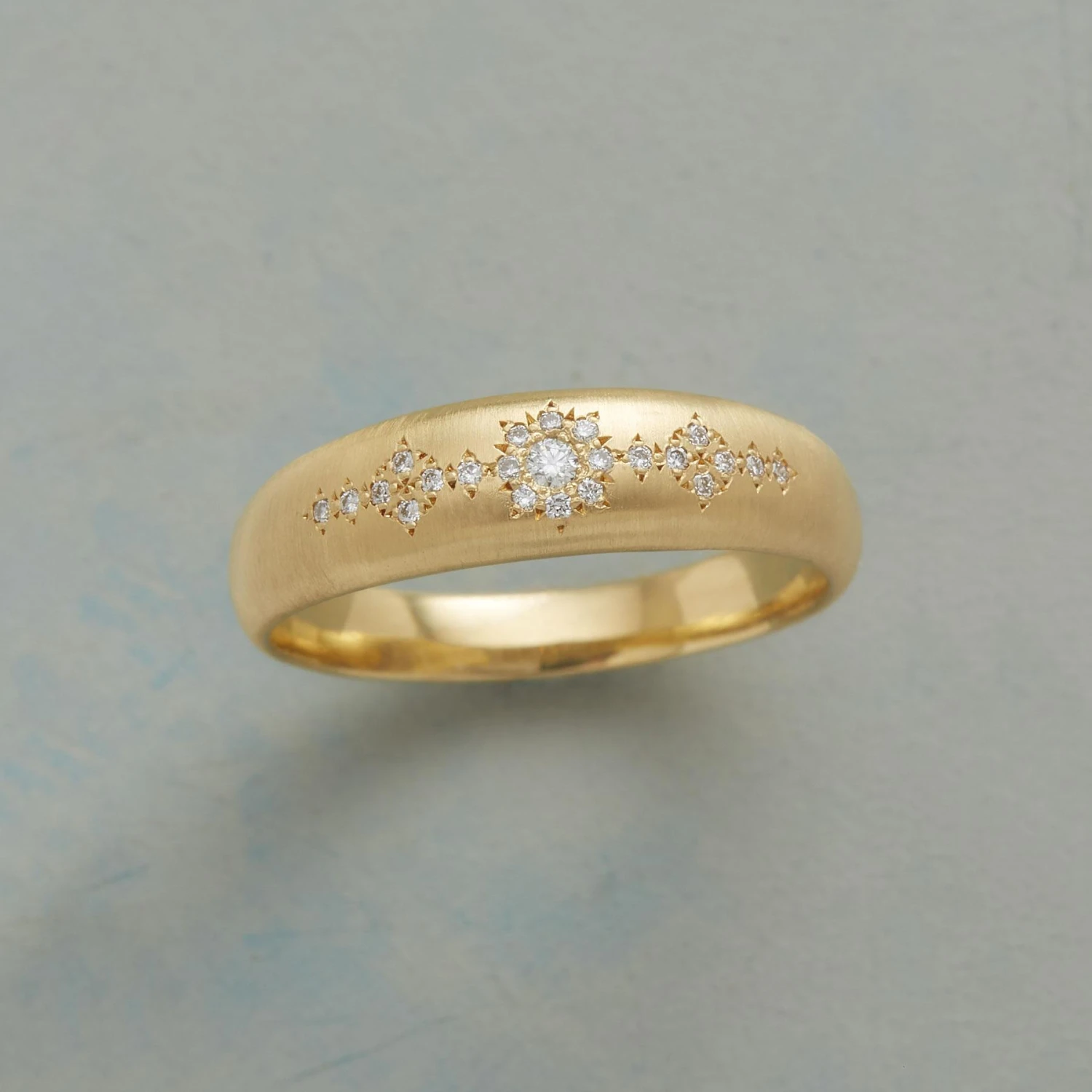 Adel Chefridi fills starburst etchings with diamonds akin to starlight itself. Set into satin finished 18kt gold, they dazzle. Handmade in USA. Whole sizes 5-9.