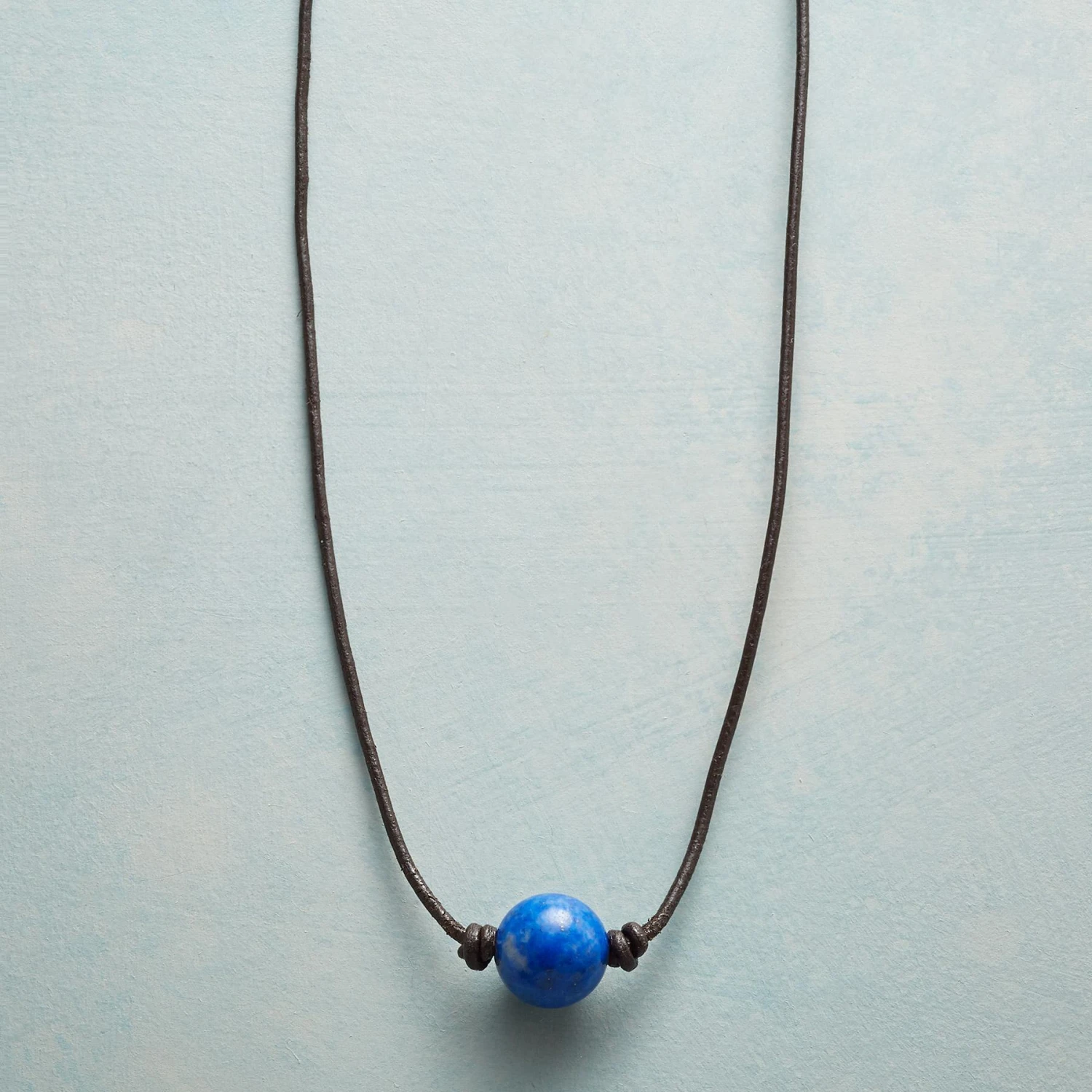 Knots keep a blue lapis lazuli snugly in place on this modern and casual leather cord necklace. Adjustable sterling silver lobster clasp. Handmade for Sundance. 16-18″l.