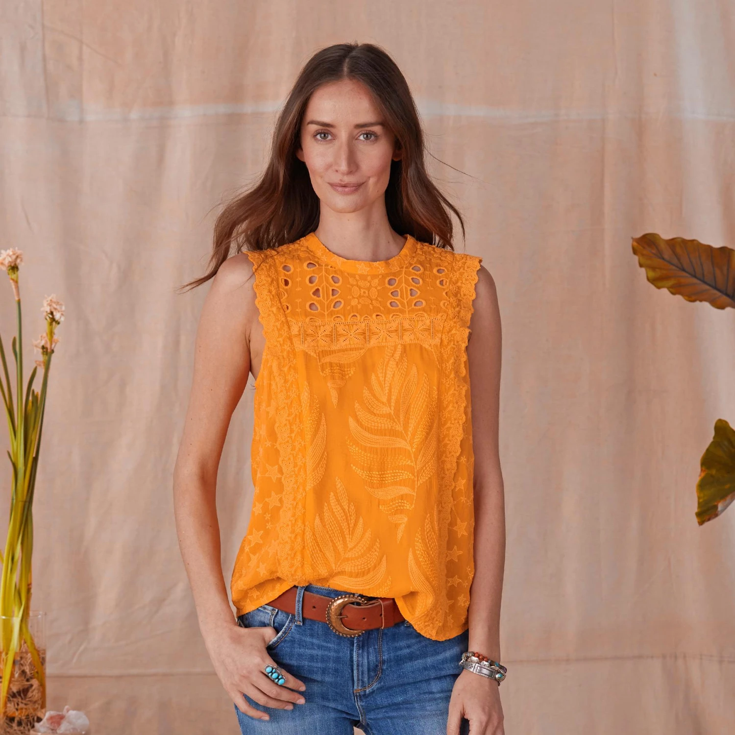 Eye-catching details abound: lace cutouts, tonal embroidery, scalloped armholes and ruffles on the front and back. Rayon. Machine wash. Imported. Sizes XS (0 to 2), S (4 to 6), M (8 to 10), L (12 to 14), XL (16 to 18), XXL (20 to 22). Approx. 25-1/4″L.