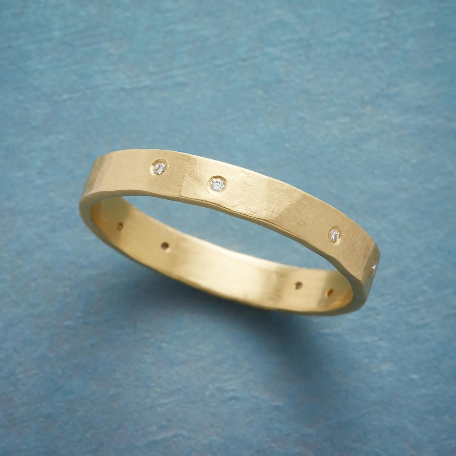 Impressions from an antique hammer impart distinctive texture to an 18kt gold band sparked with randomly spaced diamonds. Simple elegance from Sarah McGuire, handmade in USA. Whole sizes 5 to 9.