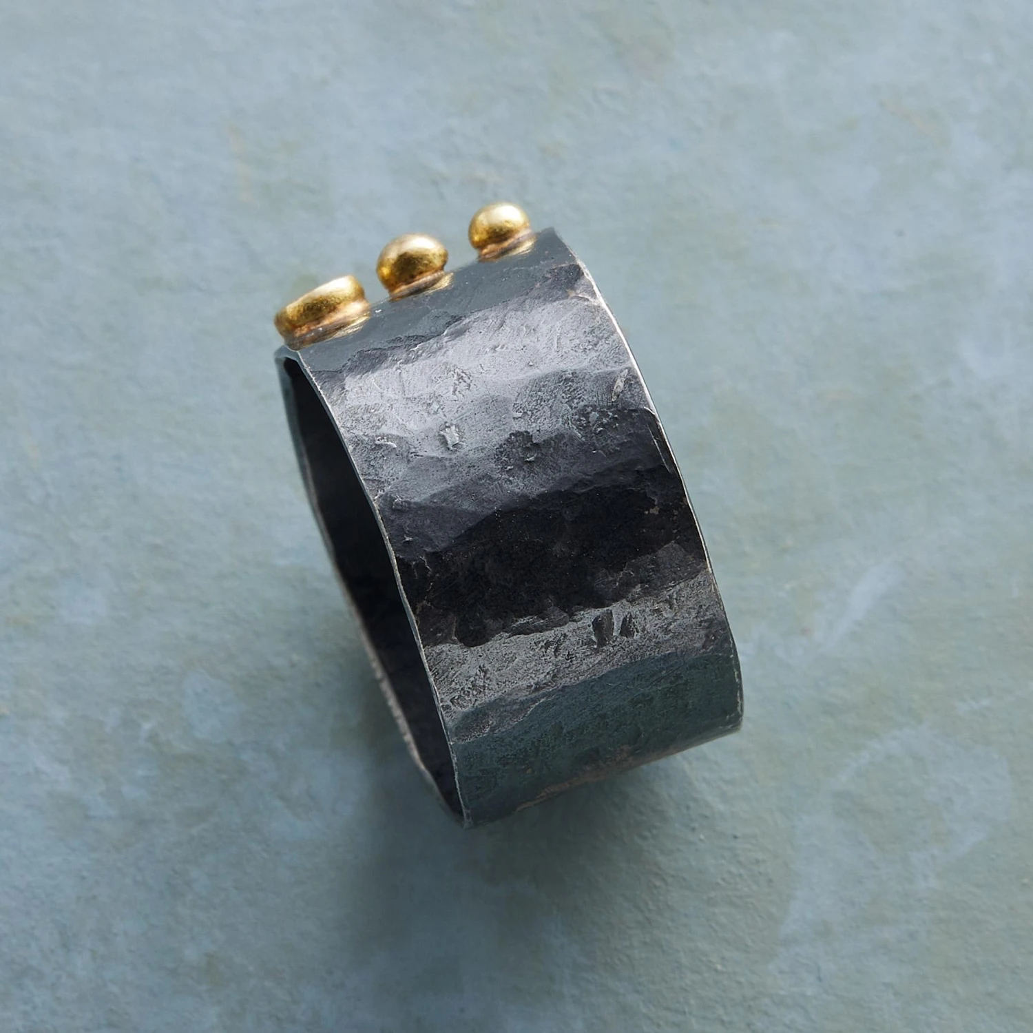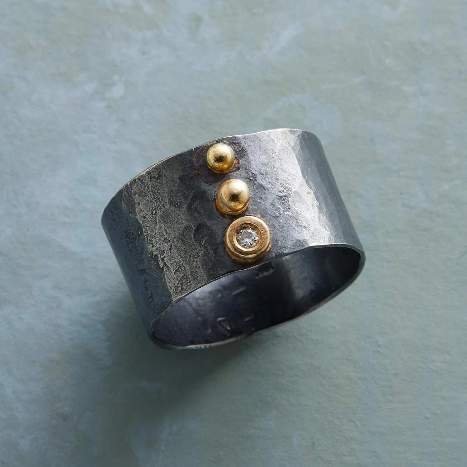 18kt gold accents draw the eye to a single diamond in a deeply oxidized hammered sterling silver band. Handcrafted in USA. Whole sizes 5-9. Approx. 3/8″w.