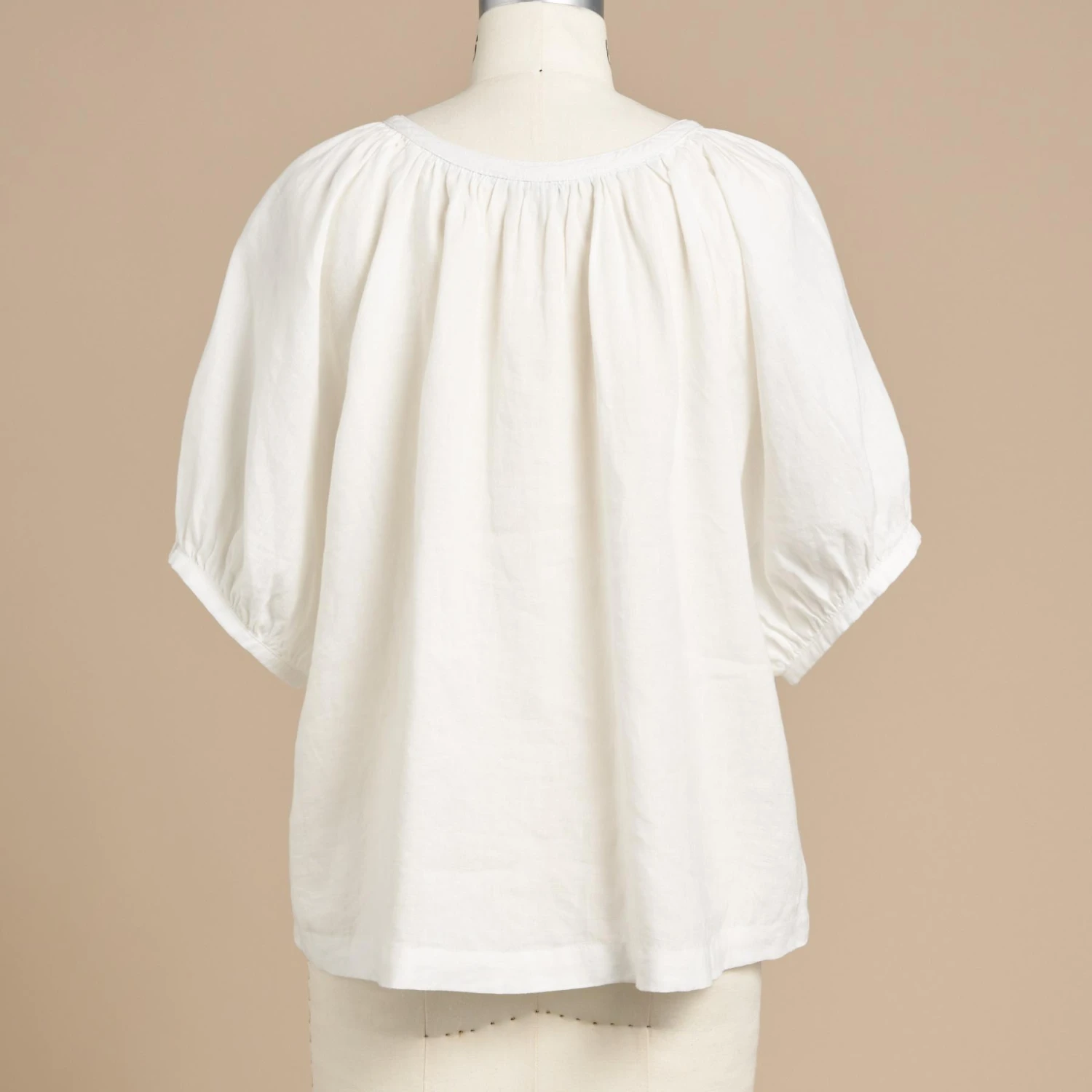 Airy and flowing, our jewel-neck top with dyed-to-match buttons at neck and cuffs, lace detail and blouson-style, elbow-length sleeves. Linen. Hand wash. Imported. Exclusive. Sizes XS (0 to 2), S (4 to 6), M (8 to 10), L (12 to 14), XL (16 to 18), XXL (20 to 22). Approx. 24-1/2″L. Recommend sizing down a full size.