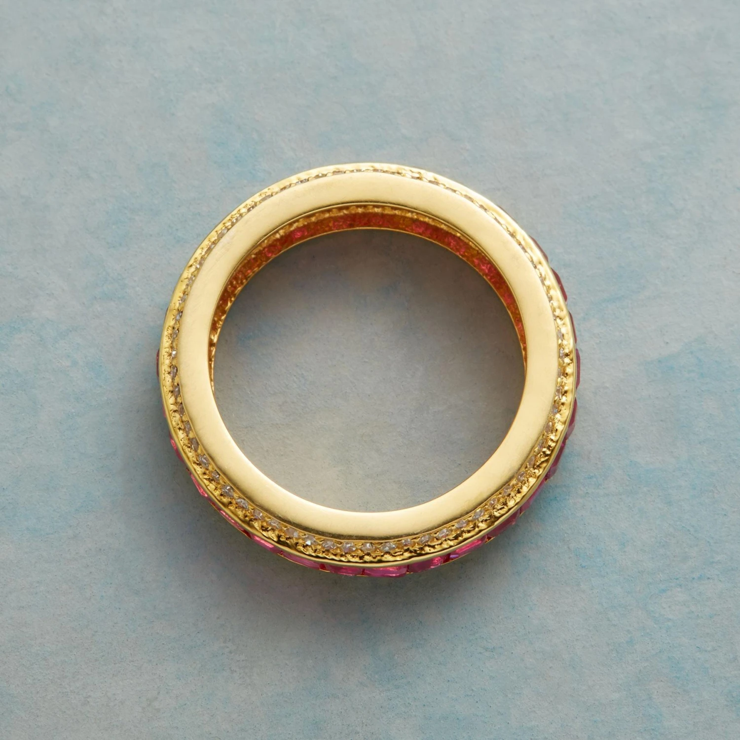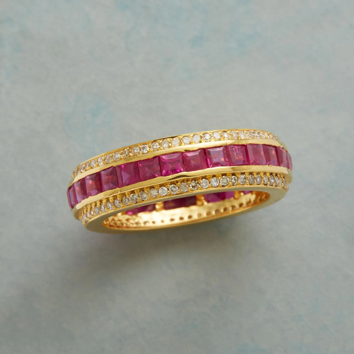 Streams of diamonds glitter on our handcrafted ring around a never ending channel of square-cut, window set rubies. 14kt gold. A handcrafted exclusive in whole sizes 6 to 9.