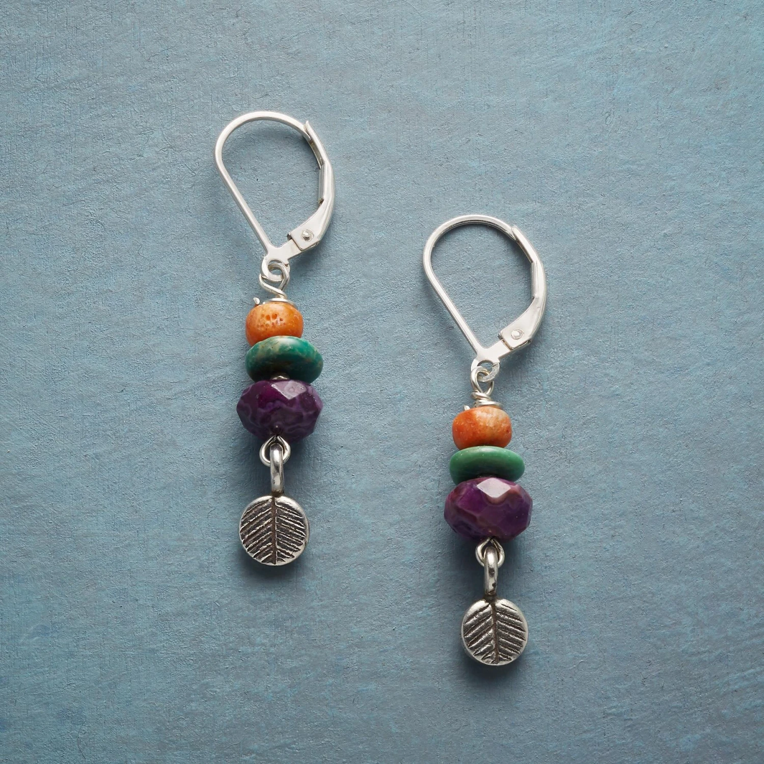 Bright stones lead to feathered Thai silver charms, apple coral, turquoise and tinted crazy lace agate. Exclusive. Handmade in USA with sterling silver lever back wires. 1-5/8″L.