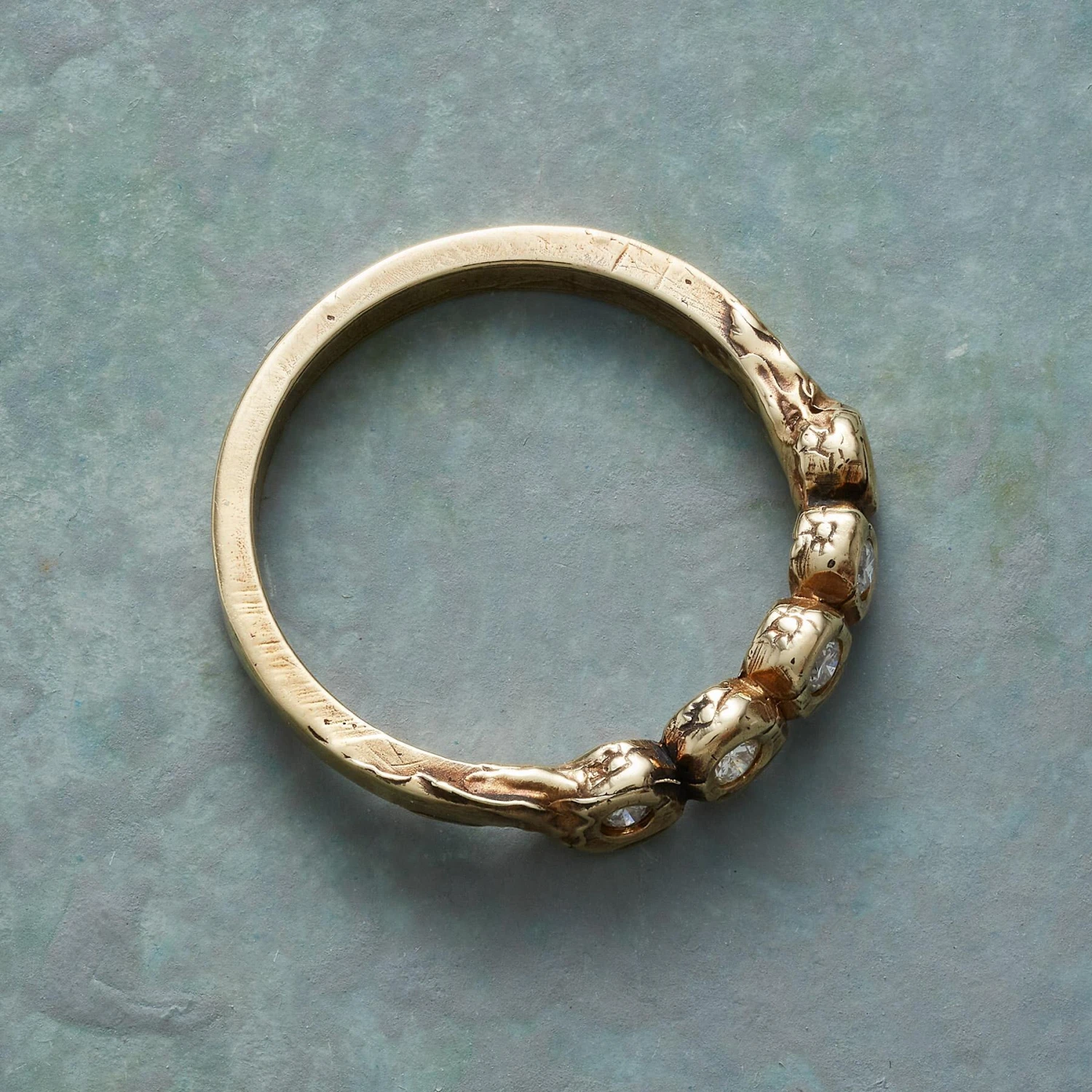 Each diamond shines eternally to honor one of the five precious elements of nature: wood, fire, earth, metal, water. Rustic irregular bezels etched with suns. Exclusive. Handmade in USA by Jes MaHarry. 14kt gold. Whole sizes 5 to 9.
