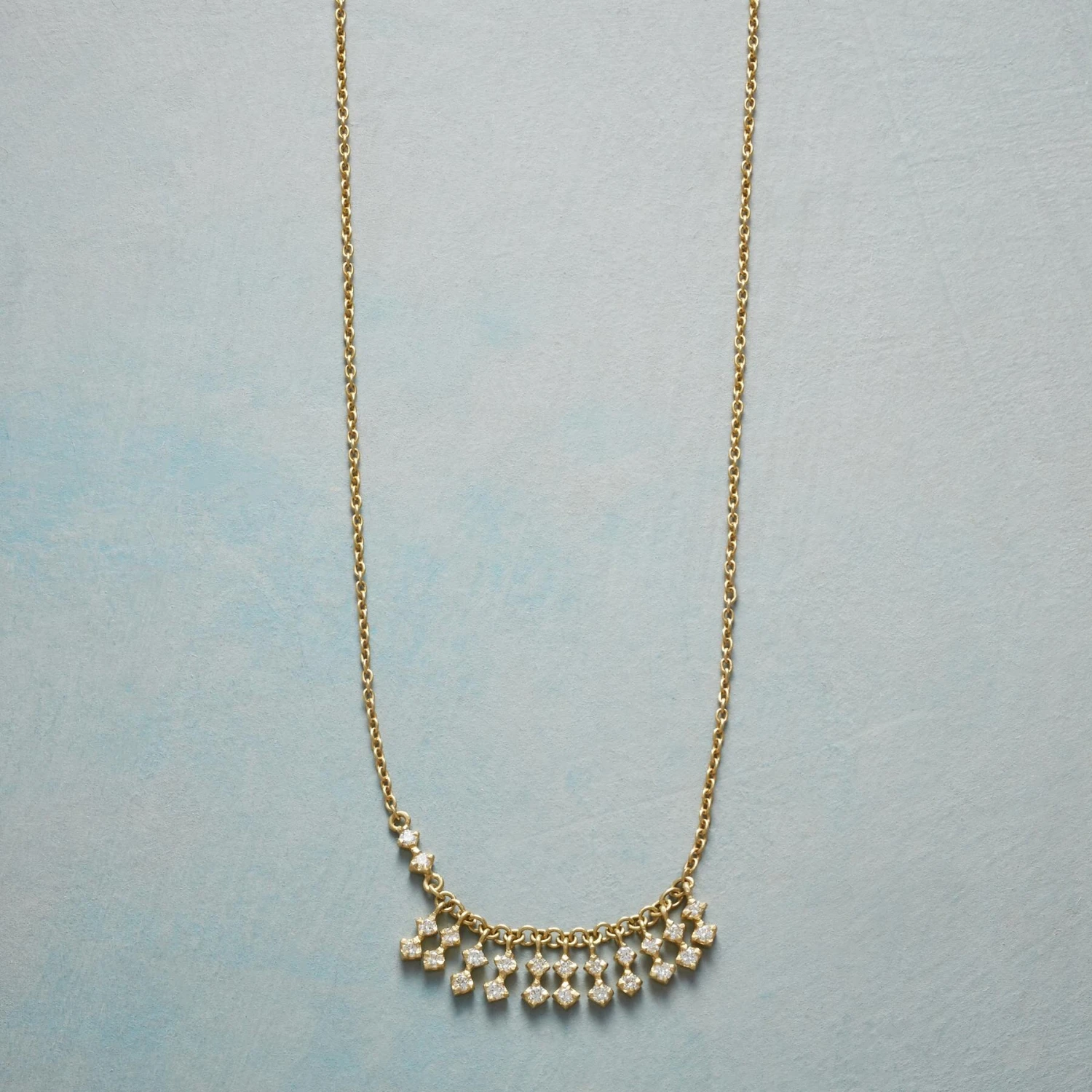 In this exquisite handcrafted necklace, pairs of prong-set diamonds gather in a glittering fringe, two more gems shimmer to one side. By Tej Kothari, 18kt gold with a hook clasp. Adjusts to 16″, 17″ or 18″L.