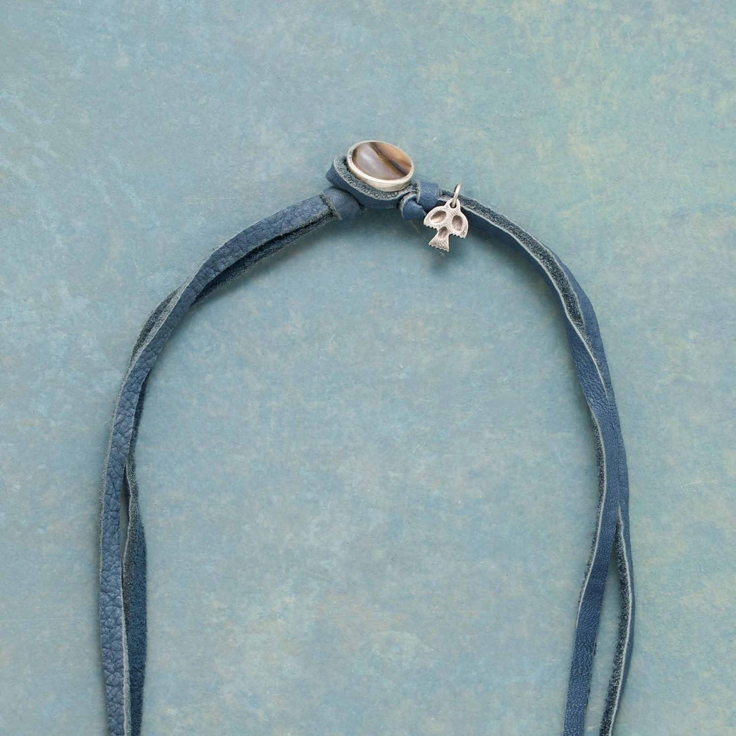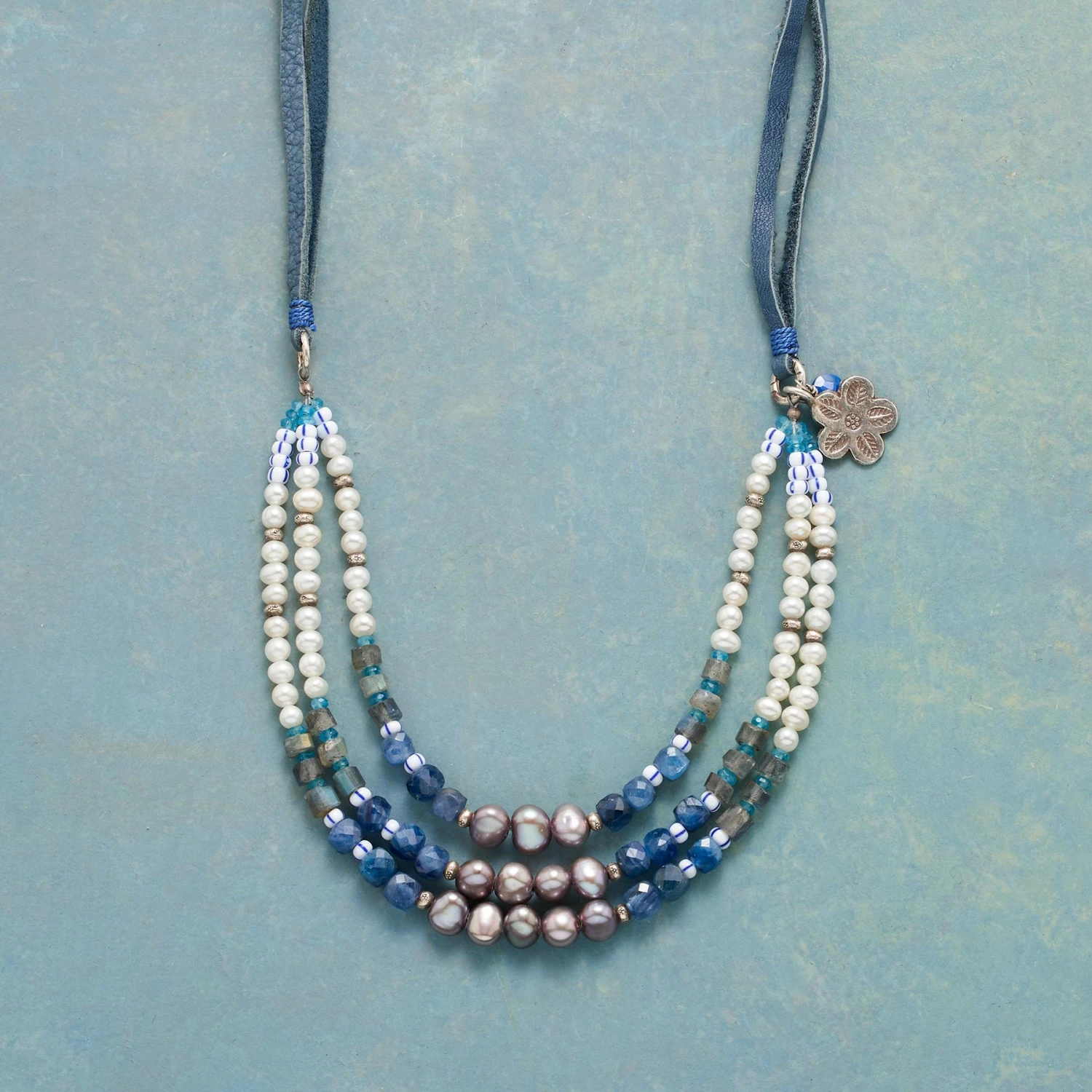 Three tiers of gems lap like waves from leather laces dyed deepwater blue. Includes labradorite, lapis, apatite, kyanite, cultured freshwater pearls and pinstriped glass beads. Sterling silver rings, flower charm and abalone-inlaid button clasp. Handcrafted. Exclusive. Approx. 18″L.