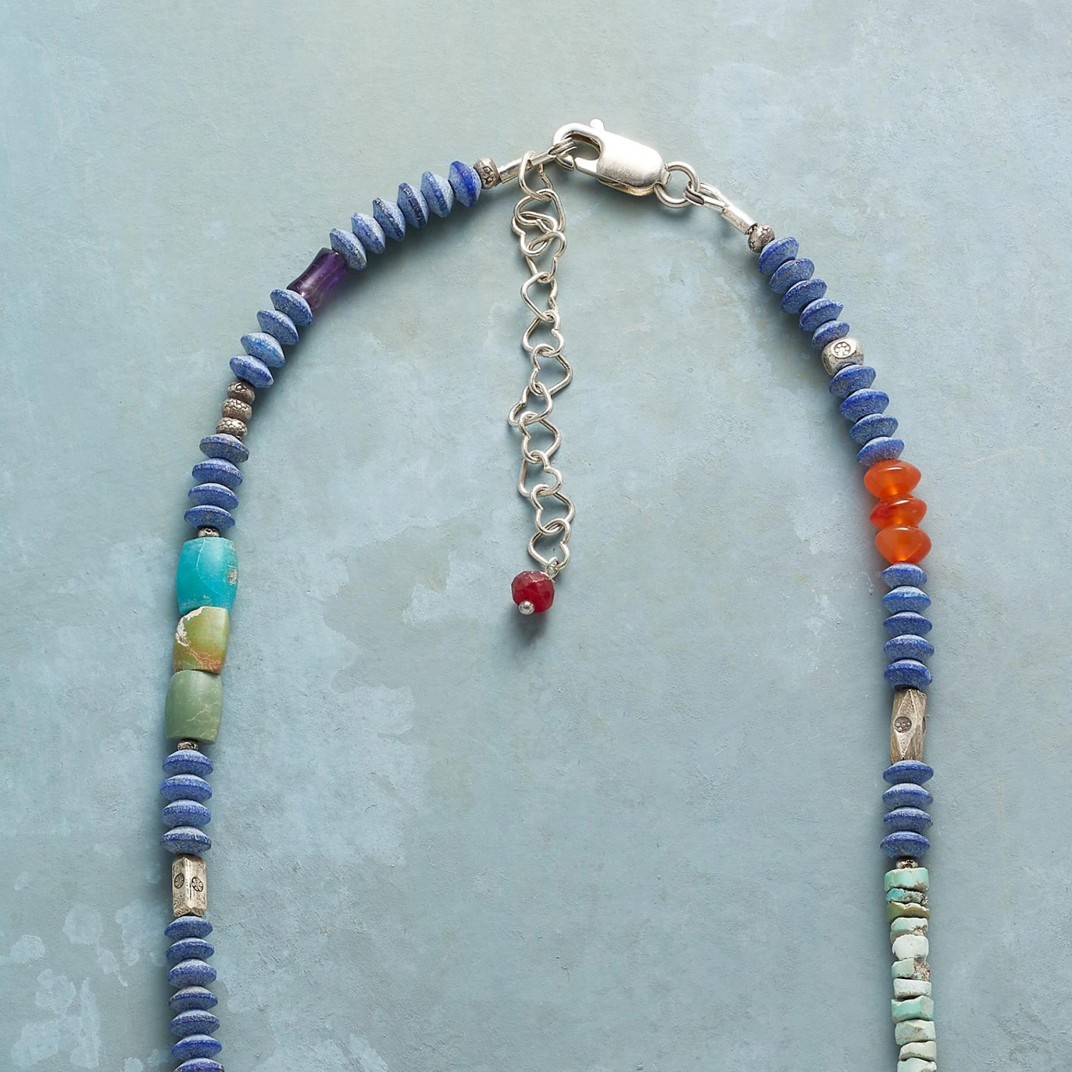 Lapis disks serve as visual touchstones between gemstones chosen for their faraway hues, ruby, amethyst, spiny oyster, and more. Exclusive. Handmade in the USA. Lobster clasp. 16″ to 17-1/2″L.