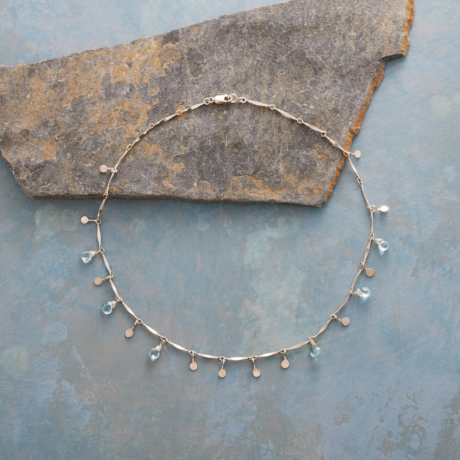 Blue topaz briolettes could just as easily be water droplets, wired to long, flat links between lilypad paillettes. Handmade in USA. Lobster clasp. Approx. 17″L.