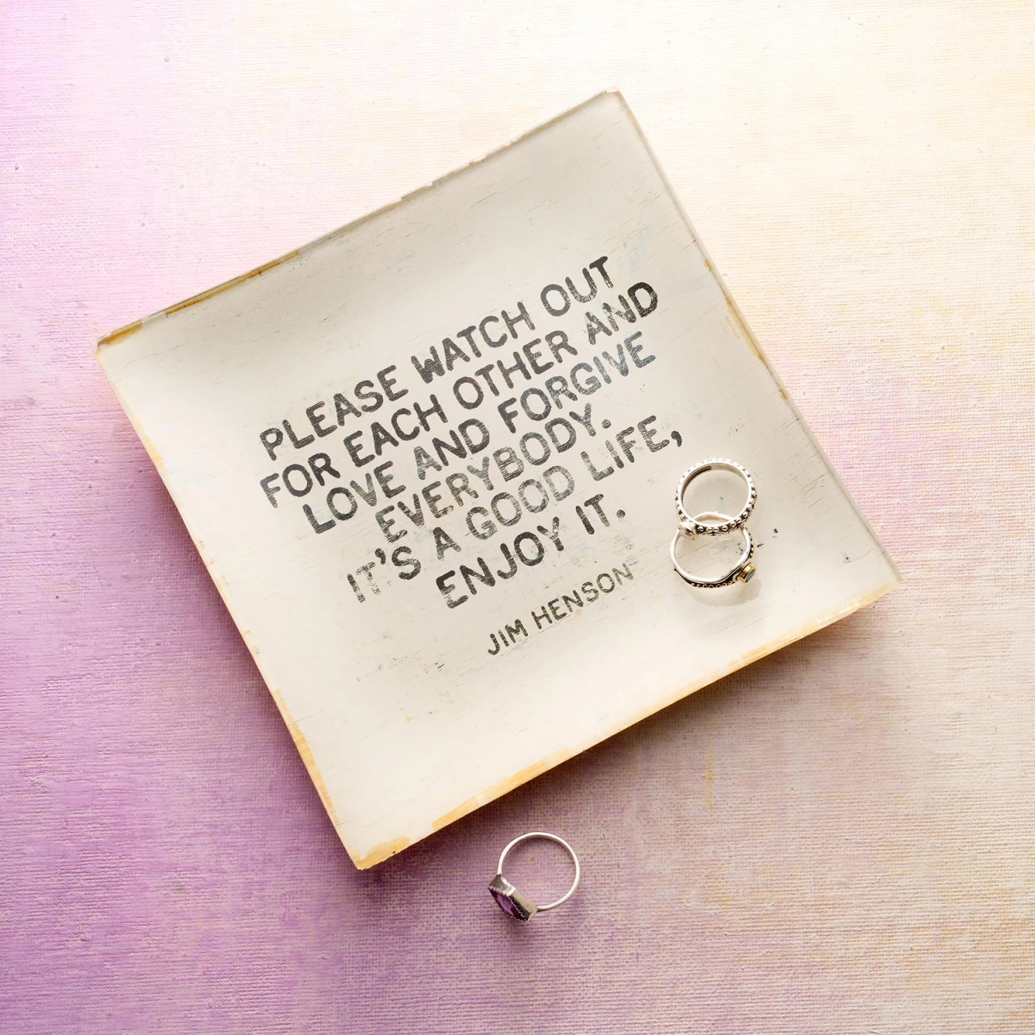 Emblazoned on this handcrafted glass dish, wise words from puppeteer Jim Henson are a timely reminder to enjoy life and take care of each other. Backed with hand-painted gold leaf. Imported. 5-3/4″sq.