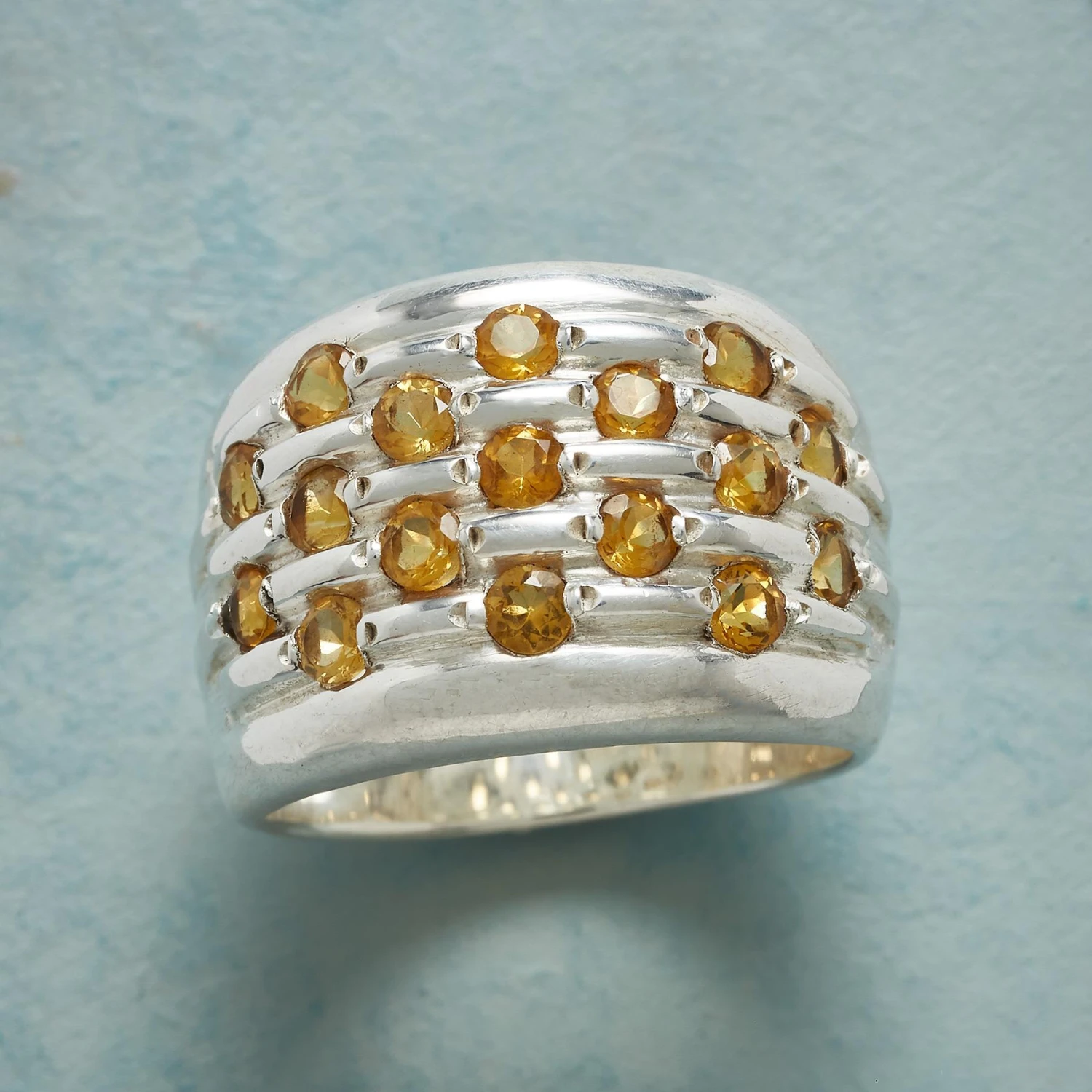 Set in sterling silver, rows of citrine glow with golden light. The wide, subtly domed band tapers smoothly at the back. Handcrafted. Exclusive. Whole sizes 5-9. 5/8″ tapers to 1/4″.