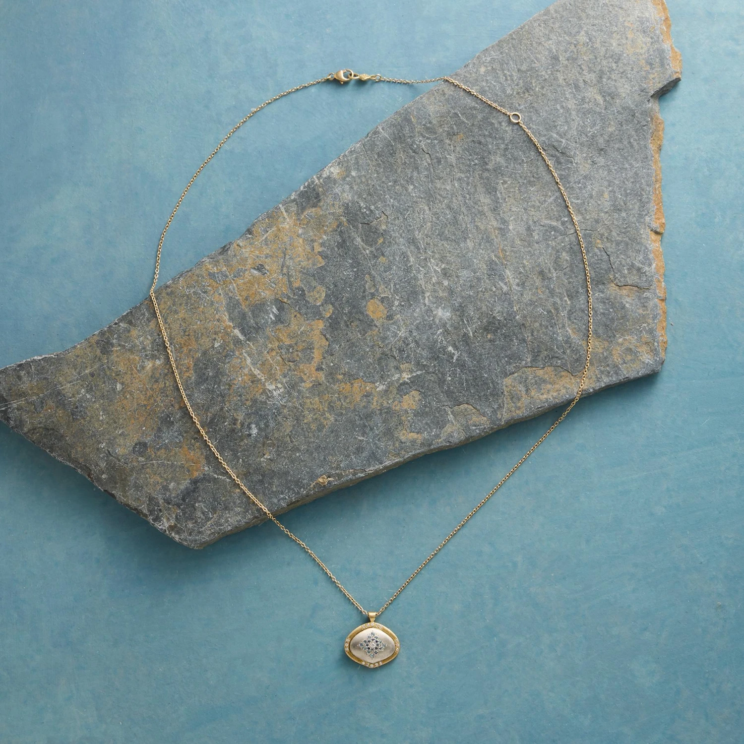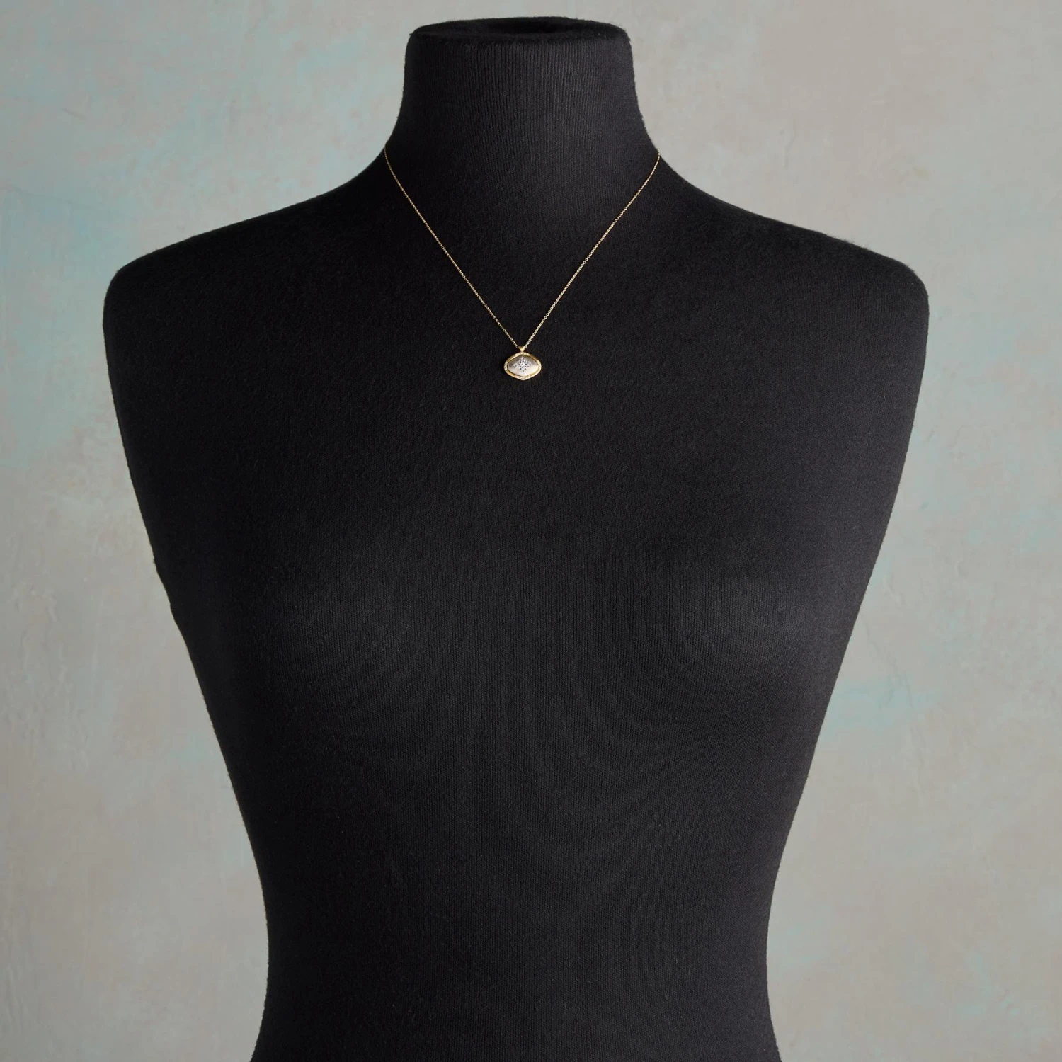 Framed in 18kt gold aglitter with diamonds, Adel Chefridi’s sterling silver pendant hosts a mosaic of diamond, aquamarine and sapphire. 18kt gold chain and lobster clasp. Handmade in USA. 16″ or 18″L; 5/8″ drop.
