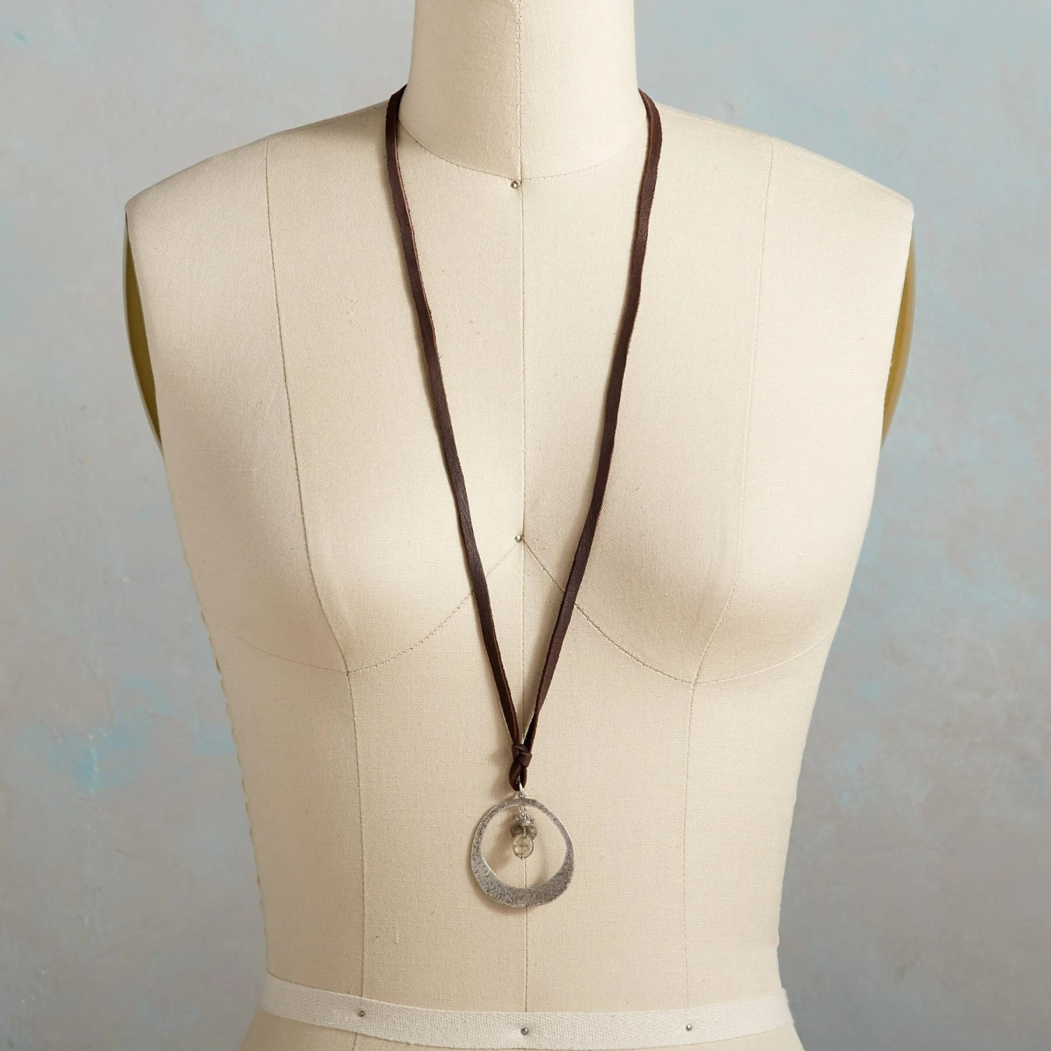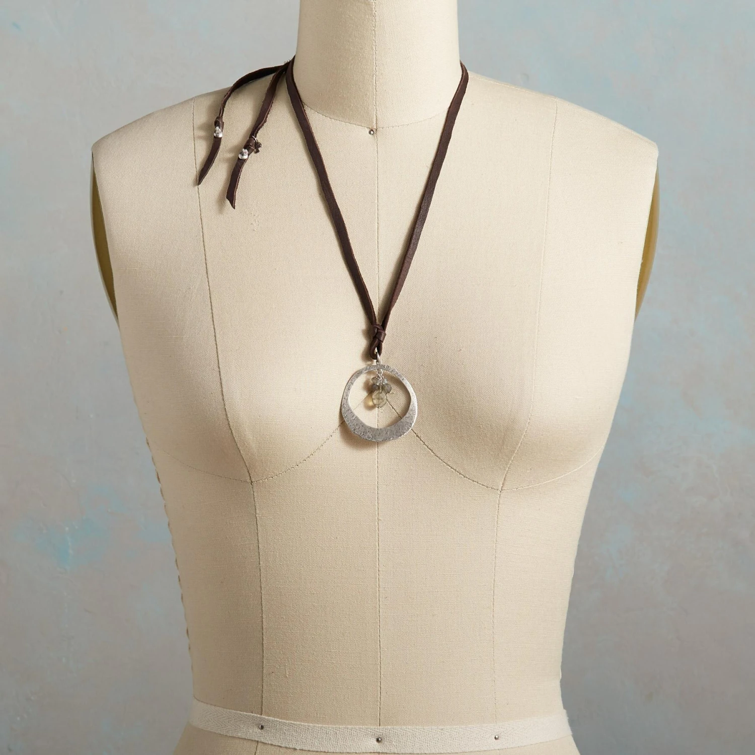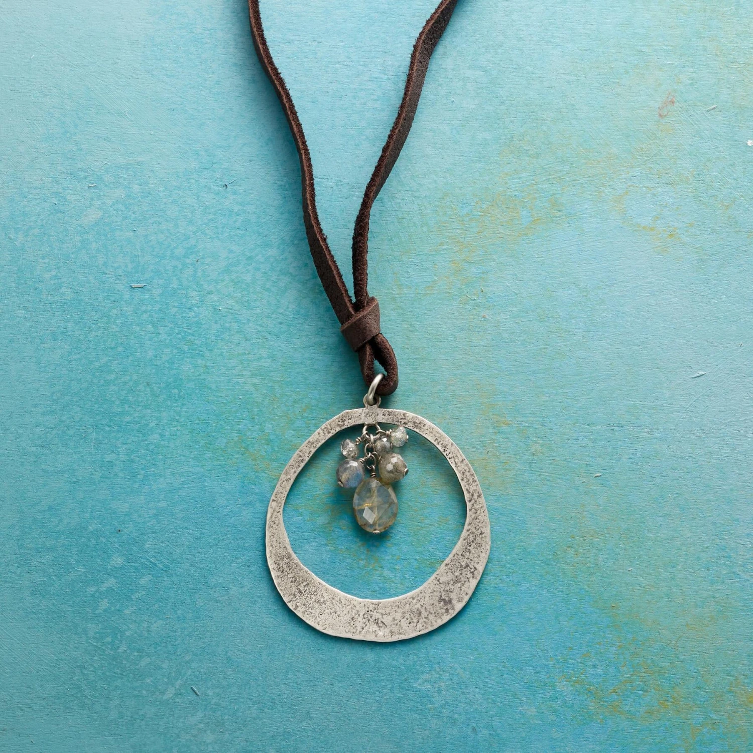 A textured circlet of sterling silver frames the twilight beauty of faceted labradorite drops. Butter-soft leather laces adjust with an etched sterling slider. Handcrafted. Exclusive. Adjustable to 32″L.