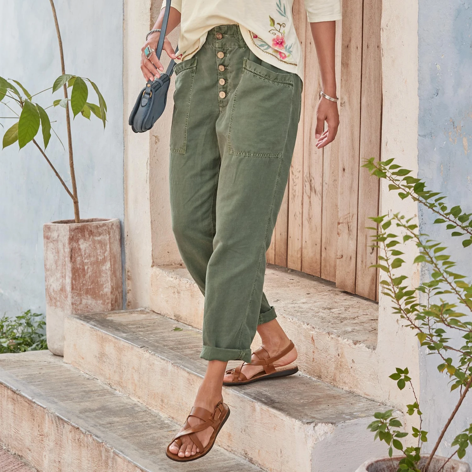Easy, button fly pants with elastic back. Ladder lace detail. Linen/cotton. Machine wash. Imported. Exclusive. Sizes 2 to 16. 28″ inseam.