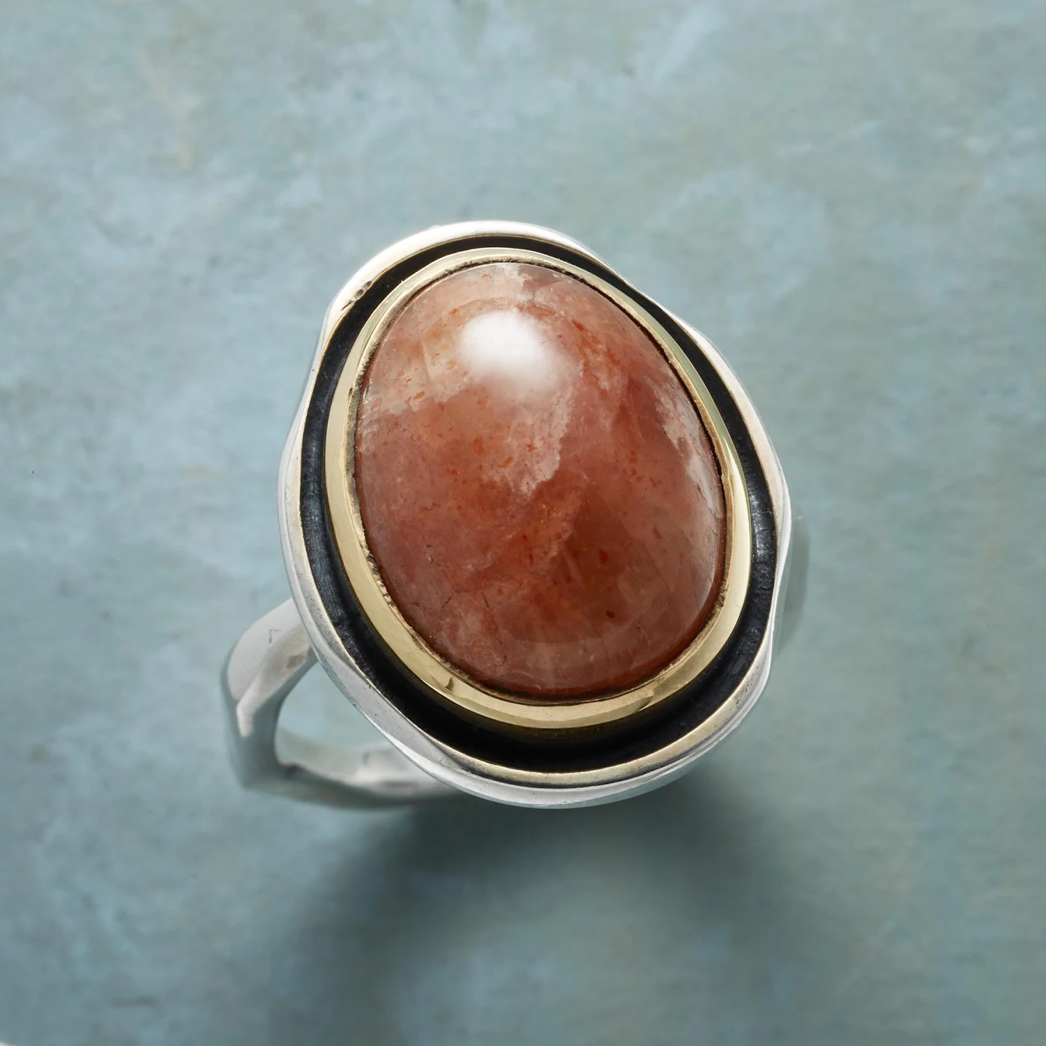 A sunstone the color and shape of a falcon’s egg rests in a polished sterling silver nest with a 14kt gold-plated rim. Handcrafted. Exclusive. Whole sizes 5–9.