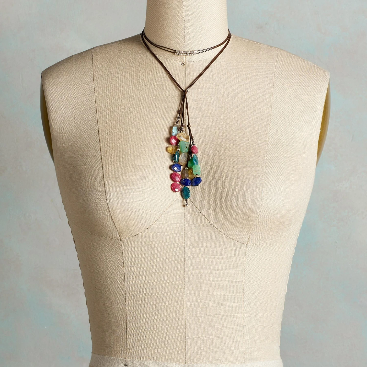 An abundance of colorful gemstones to wrap and tie as you choose. Leather lacing; Thai silver beads. Handmade. Exclusive. 38″L from end to end.
