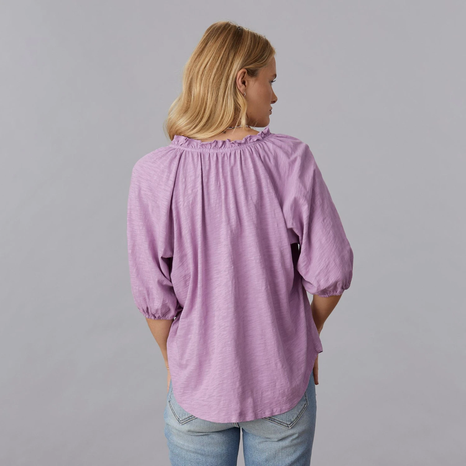 Made in our best-selling soft cotton slub. The slit-front style has a ruffle collar and shirred sleeve hem. Cotton. Machine wash. Imported. XS (0 to 2), S (4 to 6), M (8 to 10), L (12 to 14), XL (16 to 18), XXL (20 to 22). Approx. 24-3/4″L.