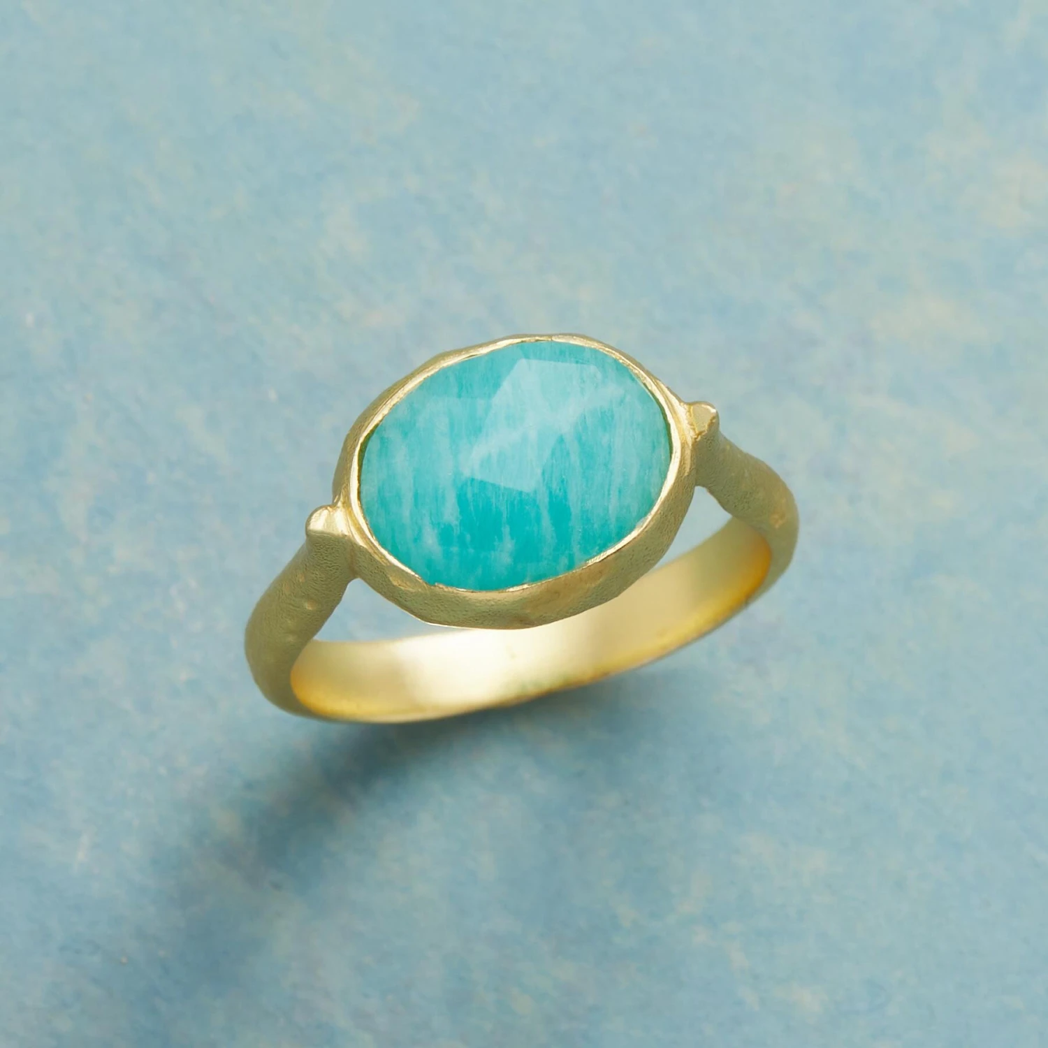 Checker-cut and set in 22kt gold-plated sterling silver, amazonite sparkles like a sun-drenched tropical sea. The oval stone is poised on a U-shaped band with a subtle, organic texture. Handcrafted. Exclusive. Whole sizes 5 to 10.