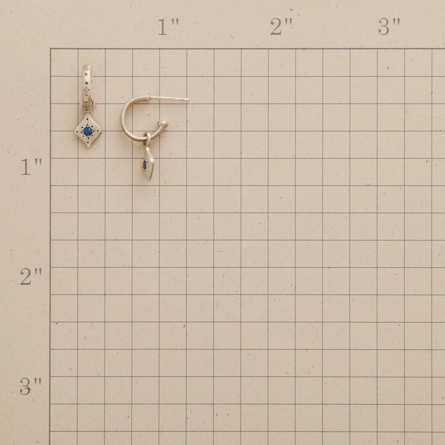 Delicate adornment with a regal touch, etched charms sparked with a single sapphire. Handmade in USA in satin sterling silver. Posts; 3/4″L.
