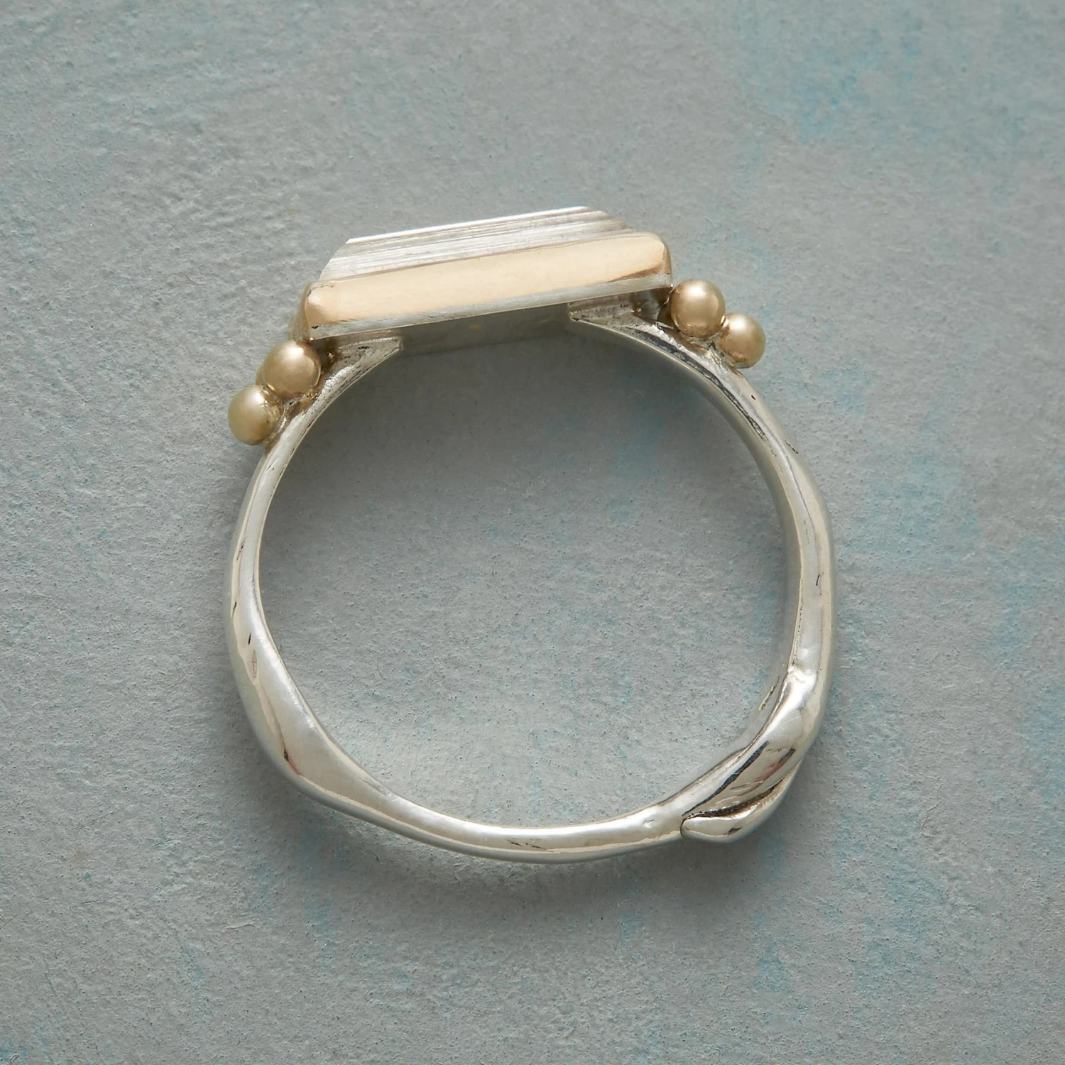 Emily Amey positions a clear quartz baguette between granulation bead trios on a sculpted organic band. Exclusive. Handcrafted in USA with recycled metals: 14kt gold bezel and beads, sterling silver band. Whole sizes 5 to 9.