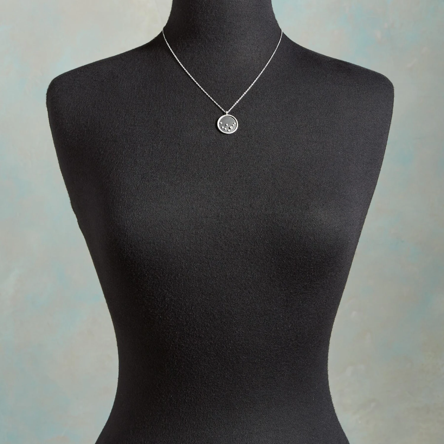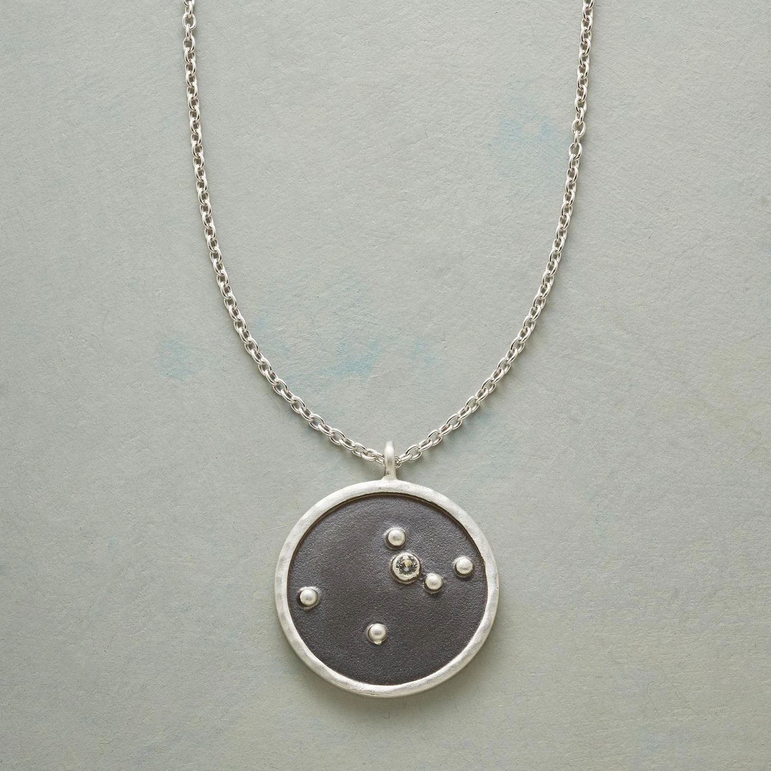 Hand cast in matte sterling silver, with a gunmetal face showing each zodiac sign’s constellation in faceted white topaz, the sign stamped on the back. Necklace with sterling silver chain; spring ring clasp. 18″L; 7/8″ dia.