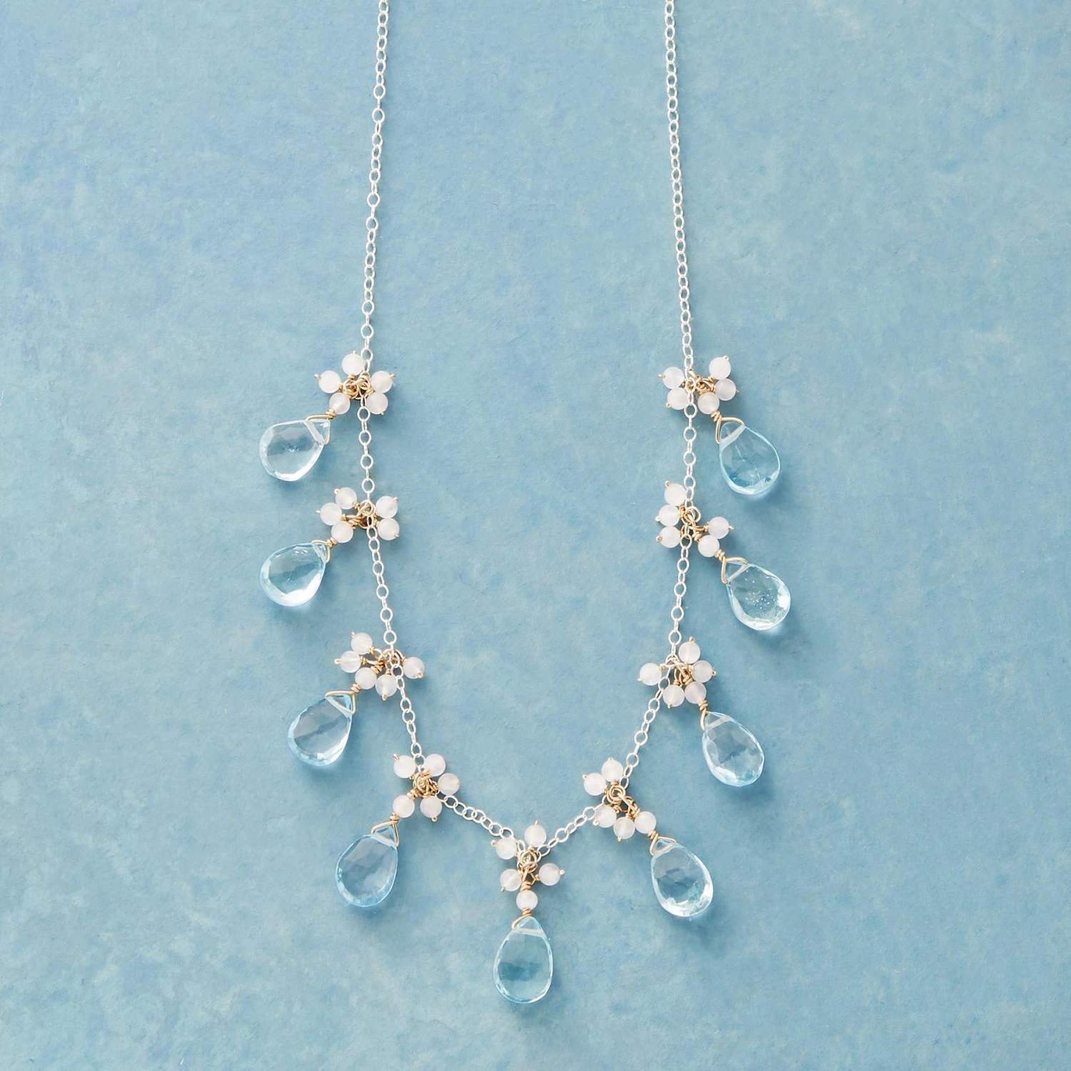 Faceted drops of blue topaz join petite rondelles of rose quartz in a necklace lovely as a soft breeze. Sterling silver chain with 14kt gold filled lobster clasp. Exclusive. 16″ to 18″L.