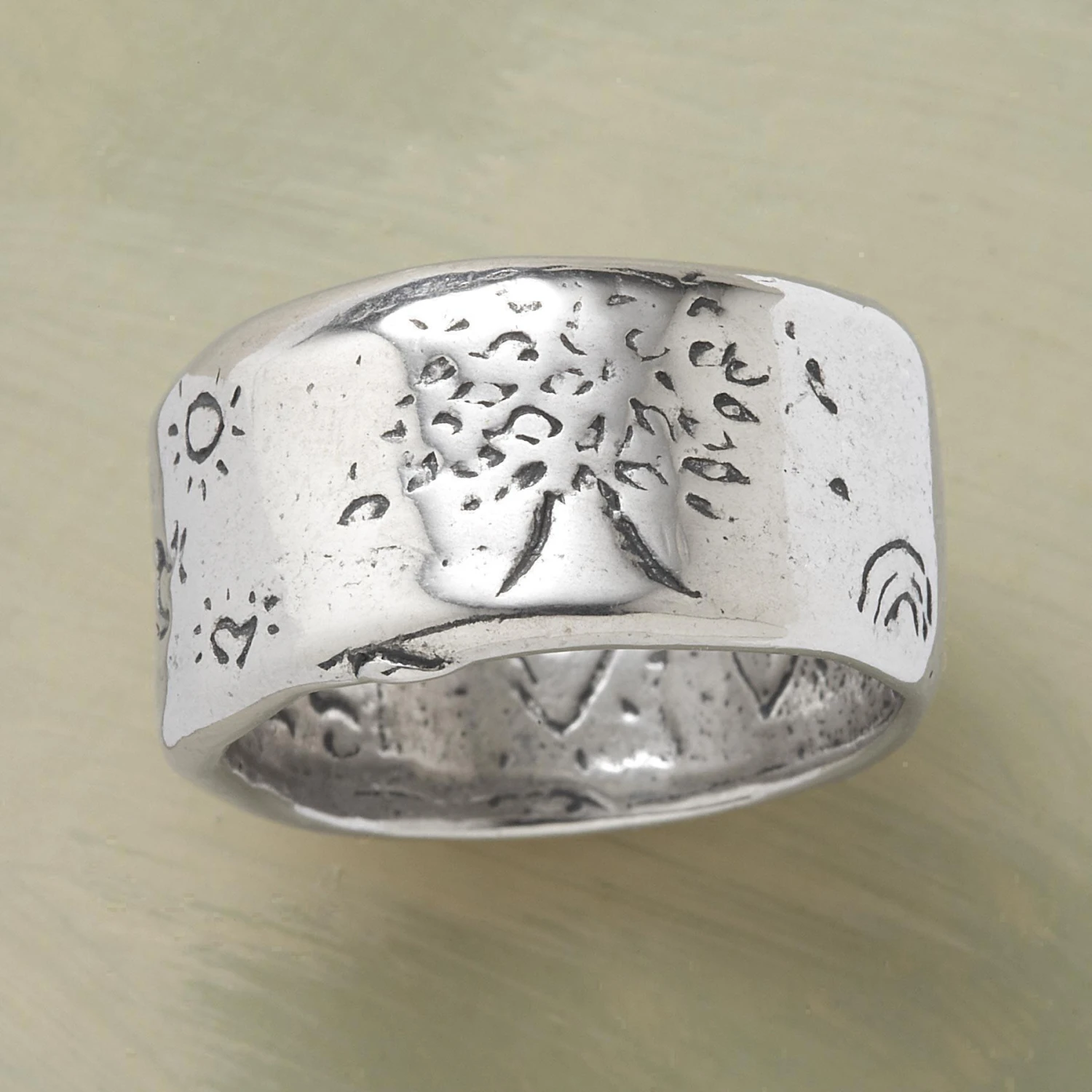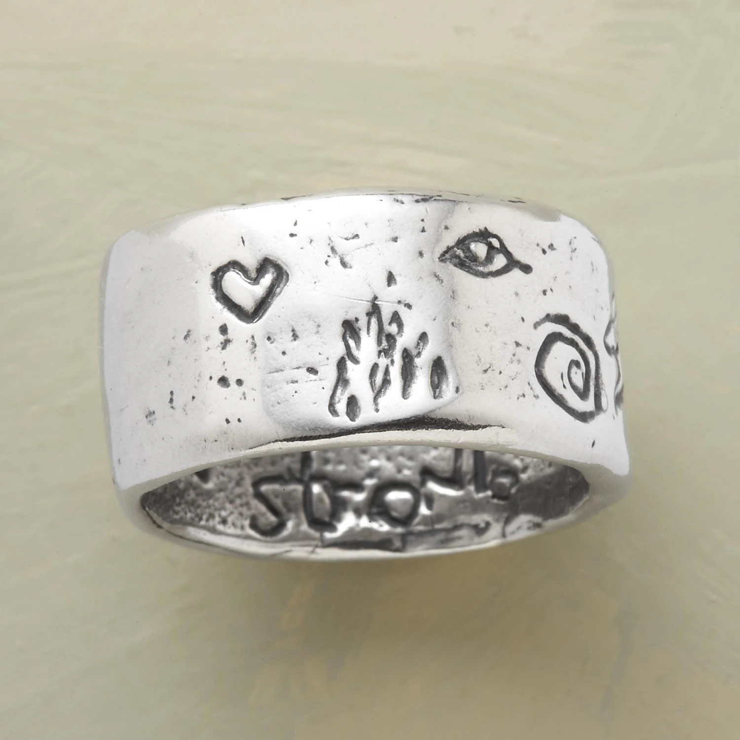 Our wonderfully hefty, sterling silver strength ring is inscribed “Grow Strong” and signed by the artist, Jes MaHarry. Made in USA. Exclusive. Whole and half sizes 5-11-1/2. 1/2″w.