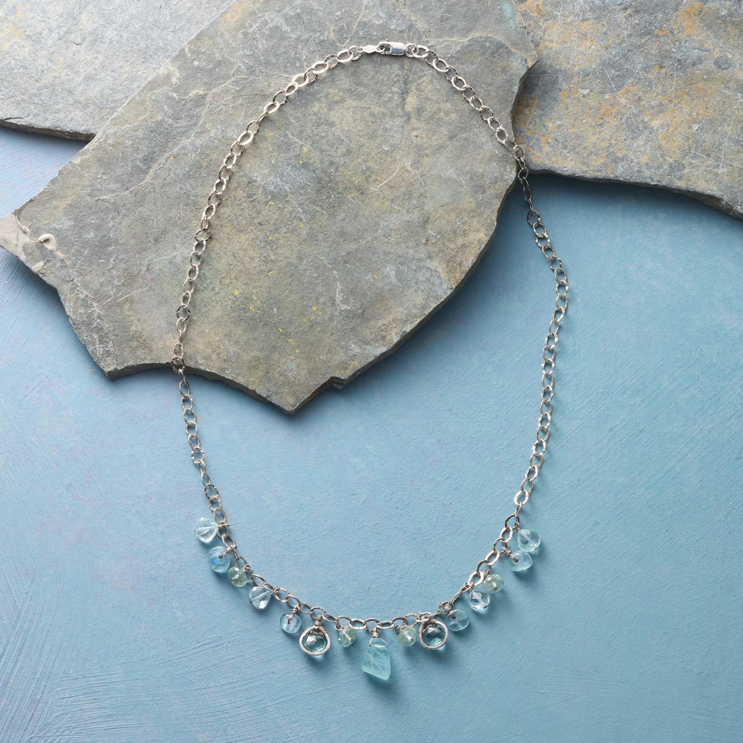 Droplets of kyanite, quartz and aquamarine in shades of blue and mossy green fall from lightly textured sterling silver links. Sterling lobster clasp. Made in USA. Exclusive. 17″L.