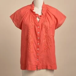 Tonal hand embroidery, shell button front, ruffle collar, subtle cap sleeves and shirring at back yoke make this light and airy top so alluring. Cotton. Hand wash. Imported. Sizes XS (0 to 2), S (4 to 6), M (8 to 10), L (12 to 14), XL (16 to 18). Approx. 24-1/4″L.