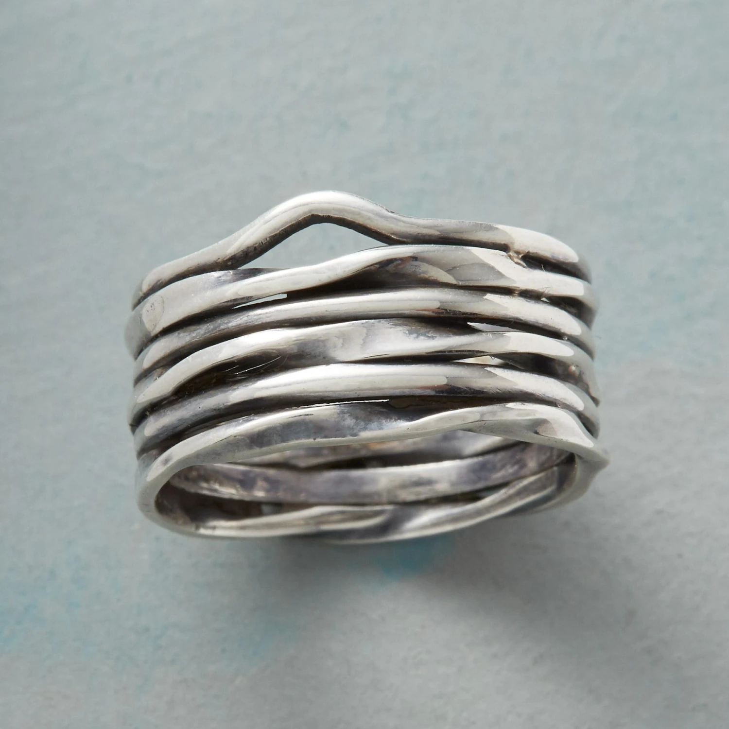 A sometimes twisting, sometimes flat strand of sterling silver makes multiple turns ’round the finger. Exclusive. Whole sizes 5 to 10. 1/2″W.