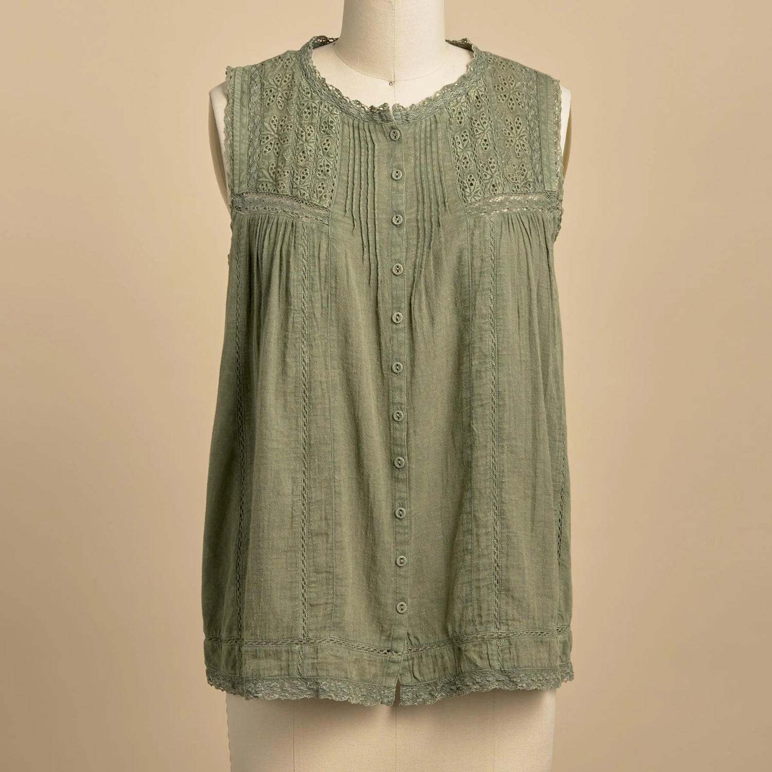 Laundry button-front, mixed knit and woven top with lovely A-line shape, lace and eyelet detail, pintucks, shirring. Cotton. Machine wash. Imported. Exclusive. Sizes XS (0 to 2), S (4 to 6), M (8 to 10), L (12 to 14), XL (16 to 18), XXL (20 to 22). Approx. 25″L.