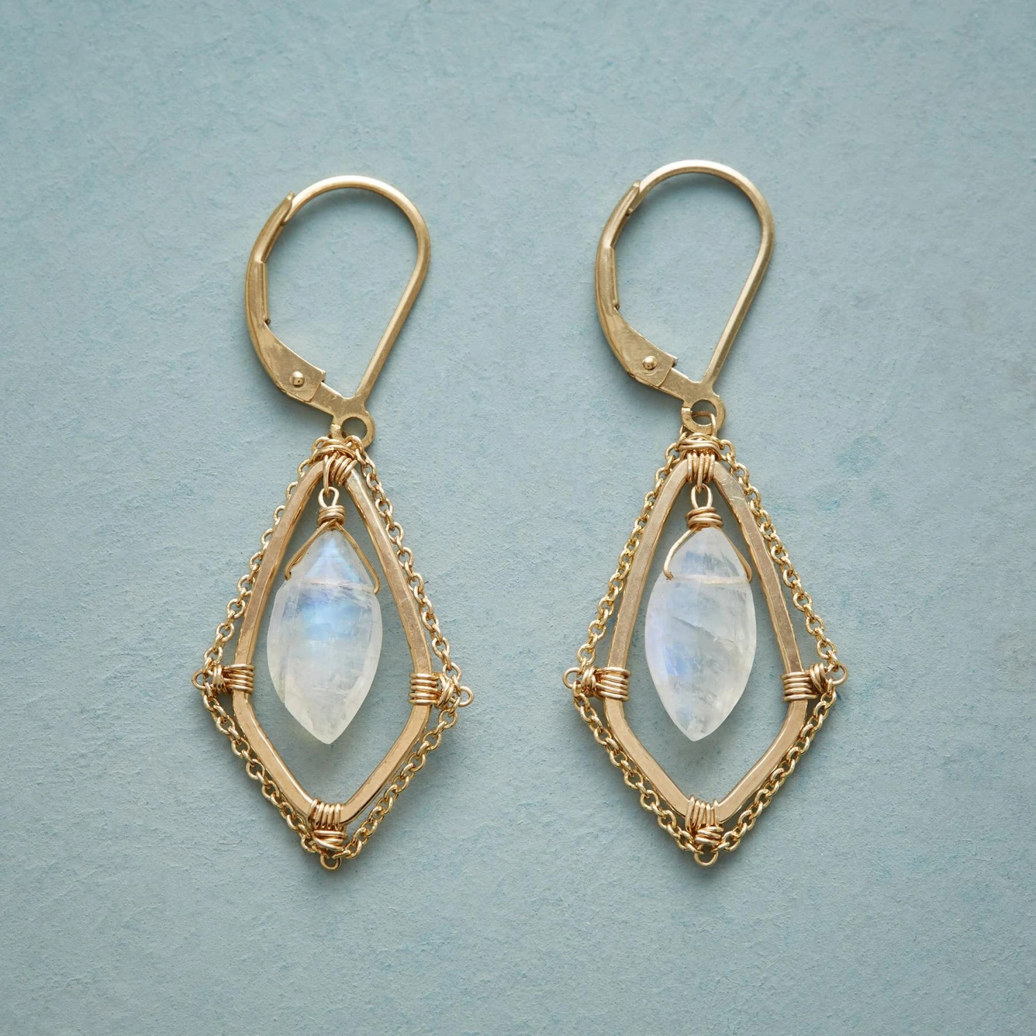 Little links form lacy edges around Dana Kellin’s earrings, creating a see-through corridor; rainbow moonstone suspended within. Handcrafted in USA. 14kt gold filled; lever back wires. 1-1/2″L.