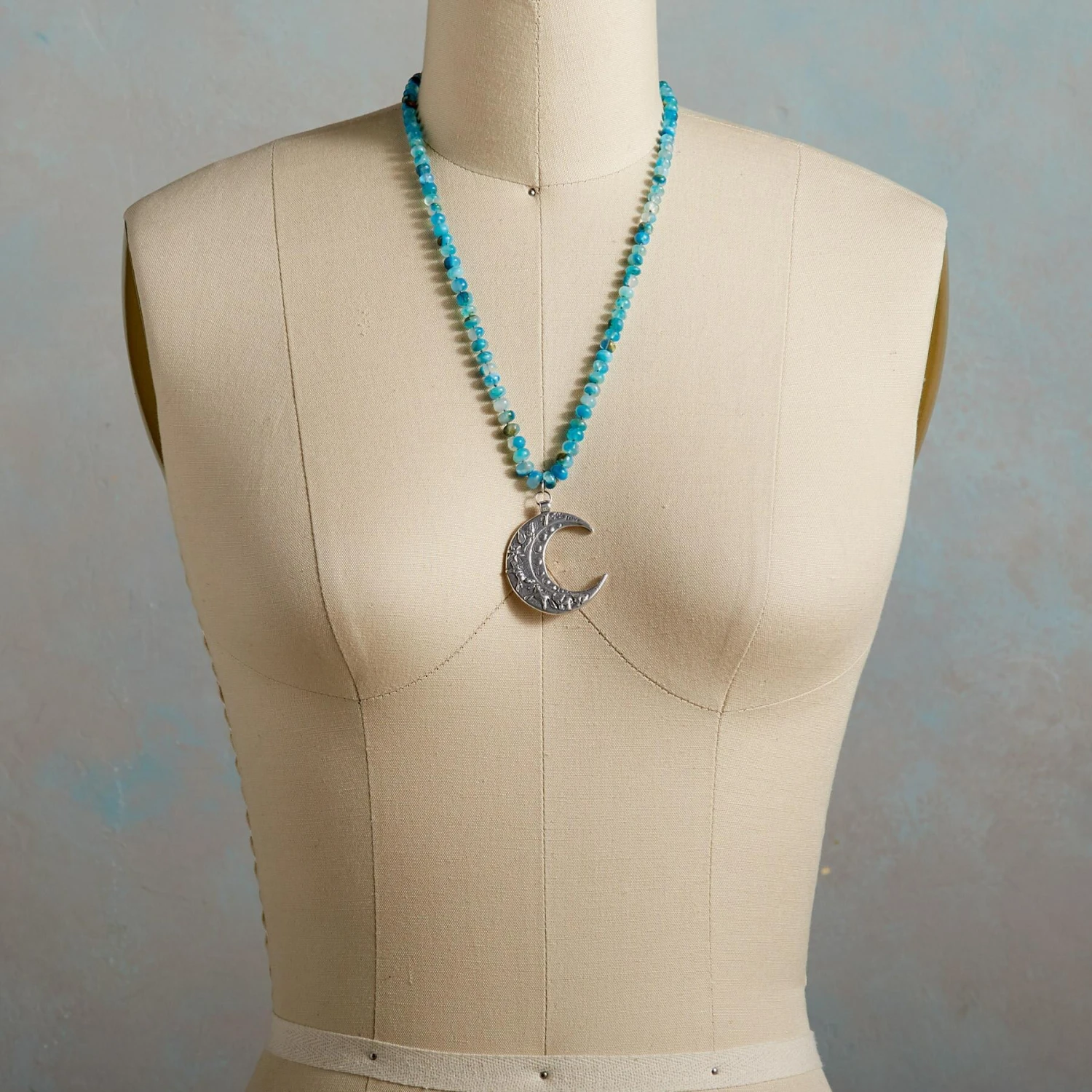 Peruvian opal and imperial topaz conjure the heavens in which Jes MaHarry’s crescent moon shines. Handcrafted of sterling silver, with birds and beasts on the front and “Love Beyond the Moon” on the back. Sterling lobster clasp. USA. Exclusive. 21-1/2″ to 22-1/2″L, 1-3/4″ dia.