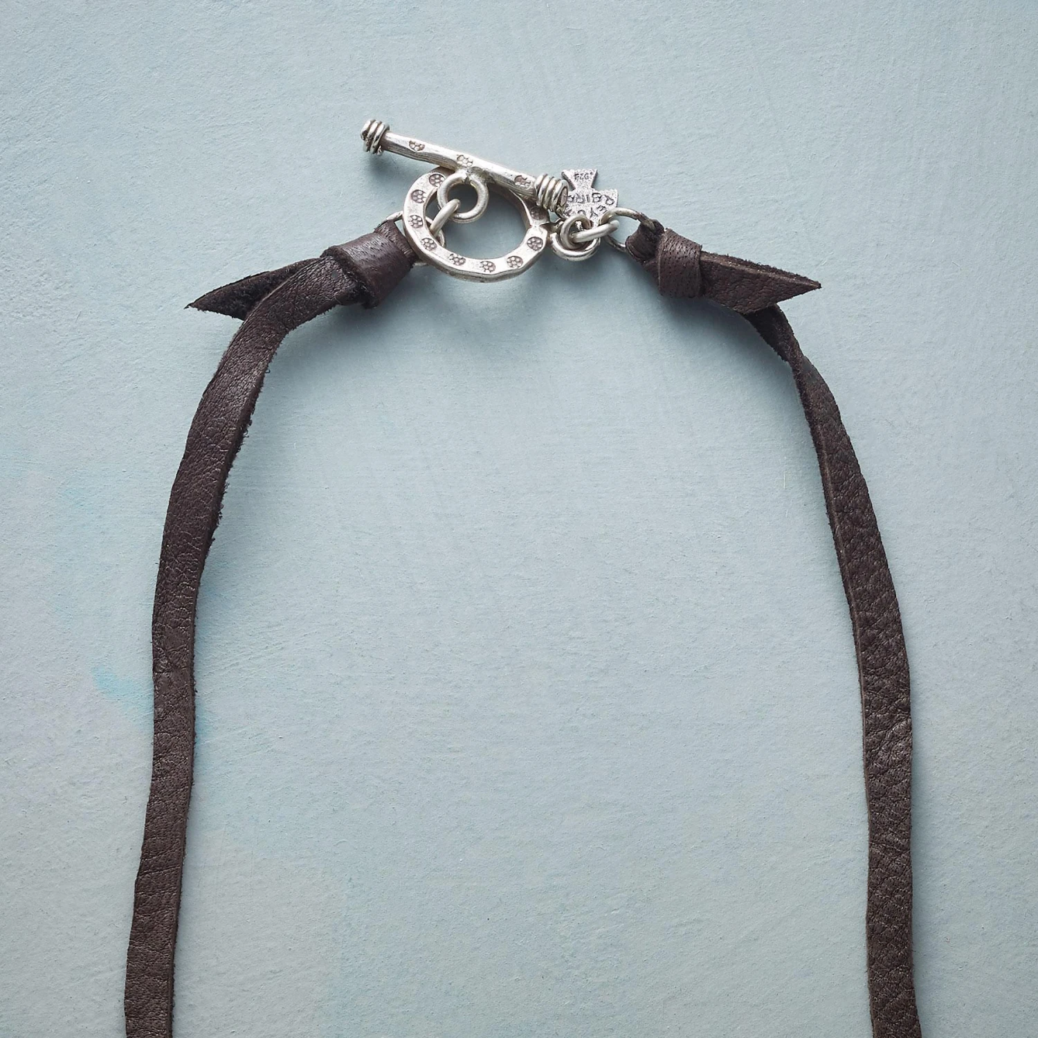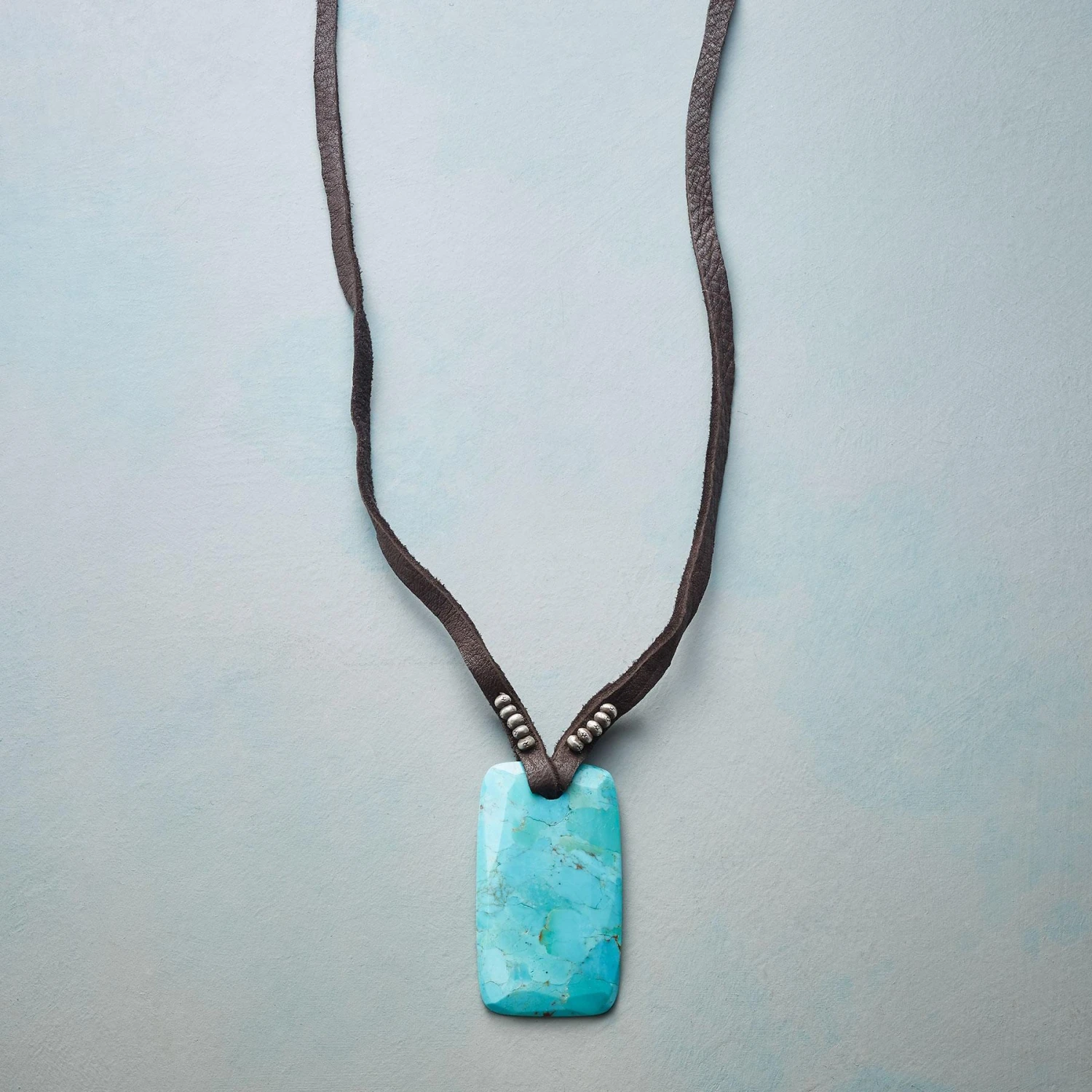 Sterling silver beads stitched to leather lacing highlight the turquoise amulet in this dramatic necklace. Gem color and matrix will vary. Toggle clasp. Handmade. Exclusive. 19″L.