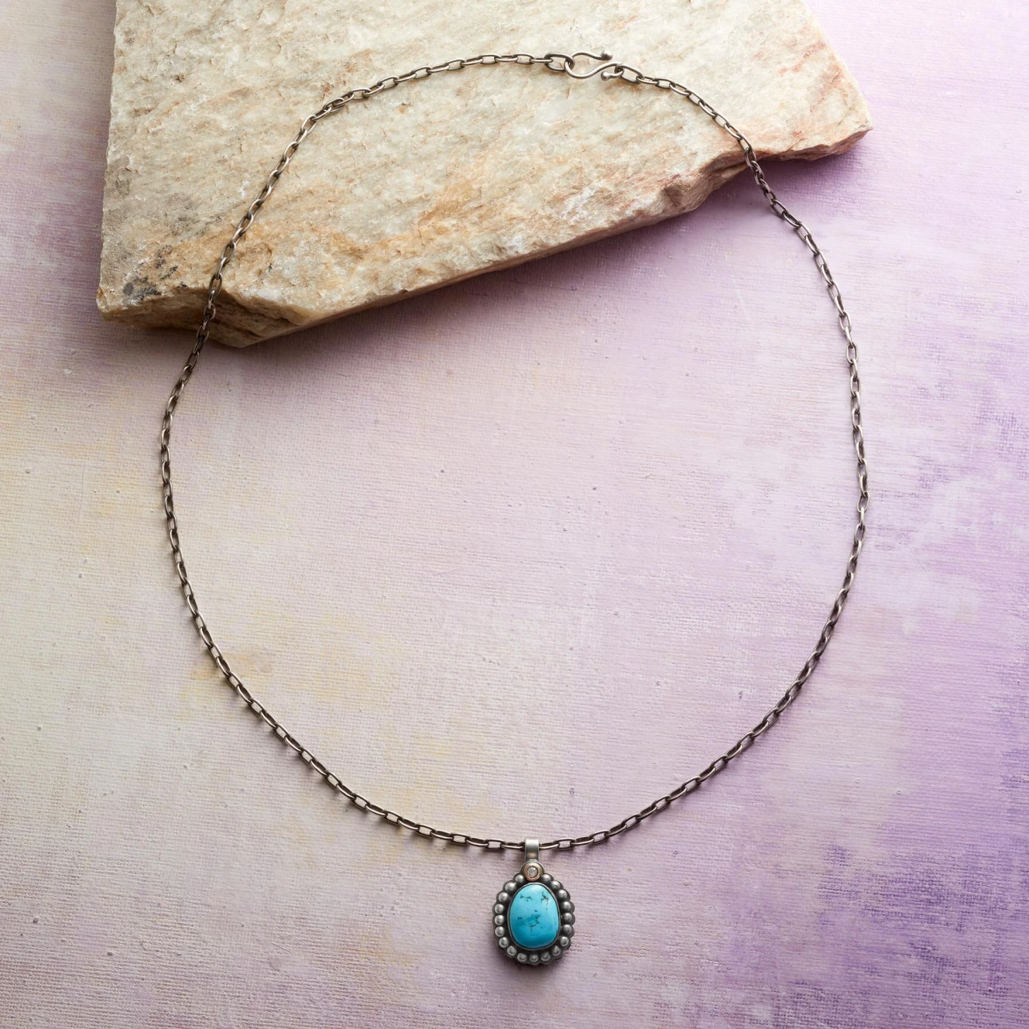 Set in a 14kt gold bezel, a single rustic diamond sparkles like a star above Sleeping Beauty turquoise in this necklace by Southwest silversmith Dennis Hogan. Edged in beaded scallops, the sterling silver pendant hangs from an antiqued silver chain with a hook and eye clasp. Handcrafted in USA exclusively for Sundance.