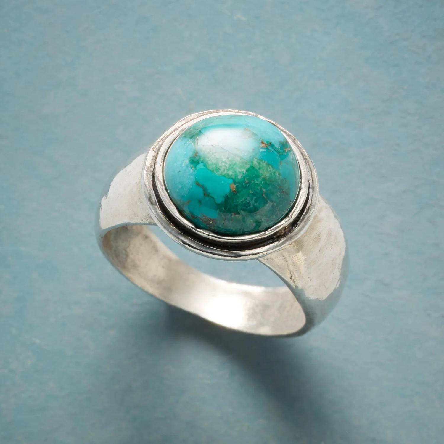 A cabochon-cut turquoise rises like an island from its hammered sterling silver band. Handcrafted. Exclusive. Whole sizes 5-9. 3/8″ tapers to 3/16″w.