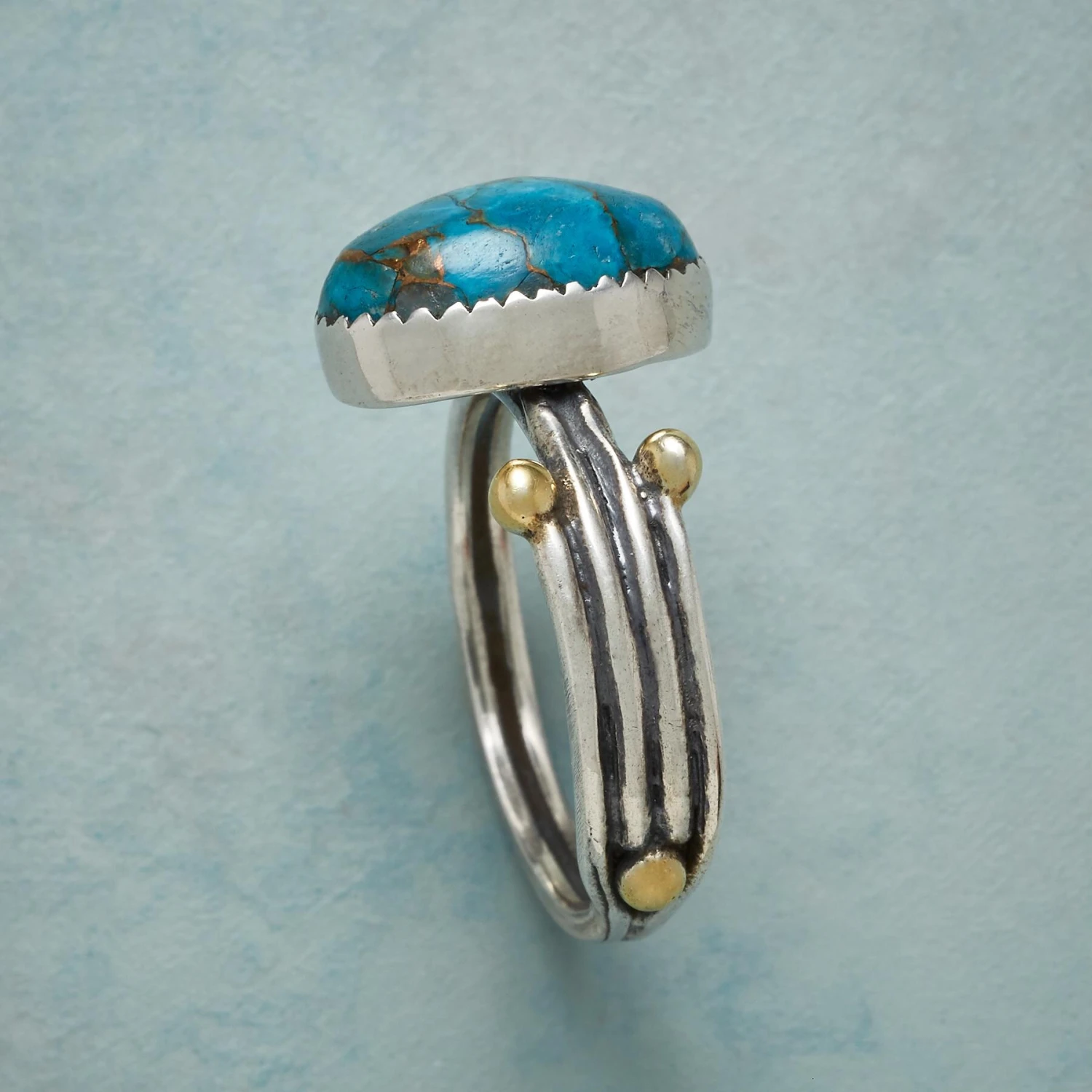 A dome of turquoise mixed with copper conjures Western vistas in this ‘Turquoise Territory’ sterling silver ring with 14kt gold plated bead balls. Exclusive. Whole sizes 5 to 10.