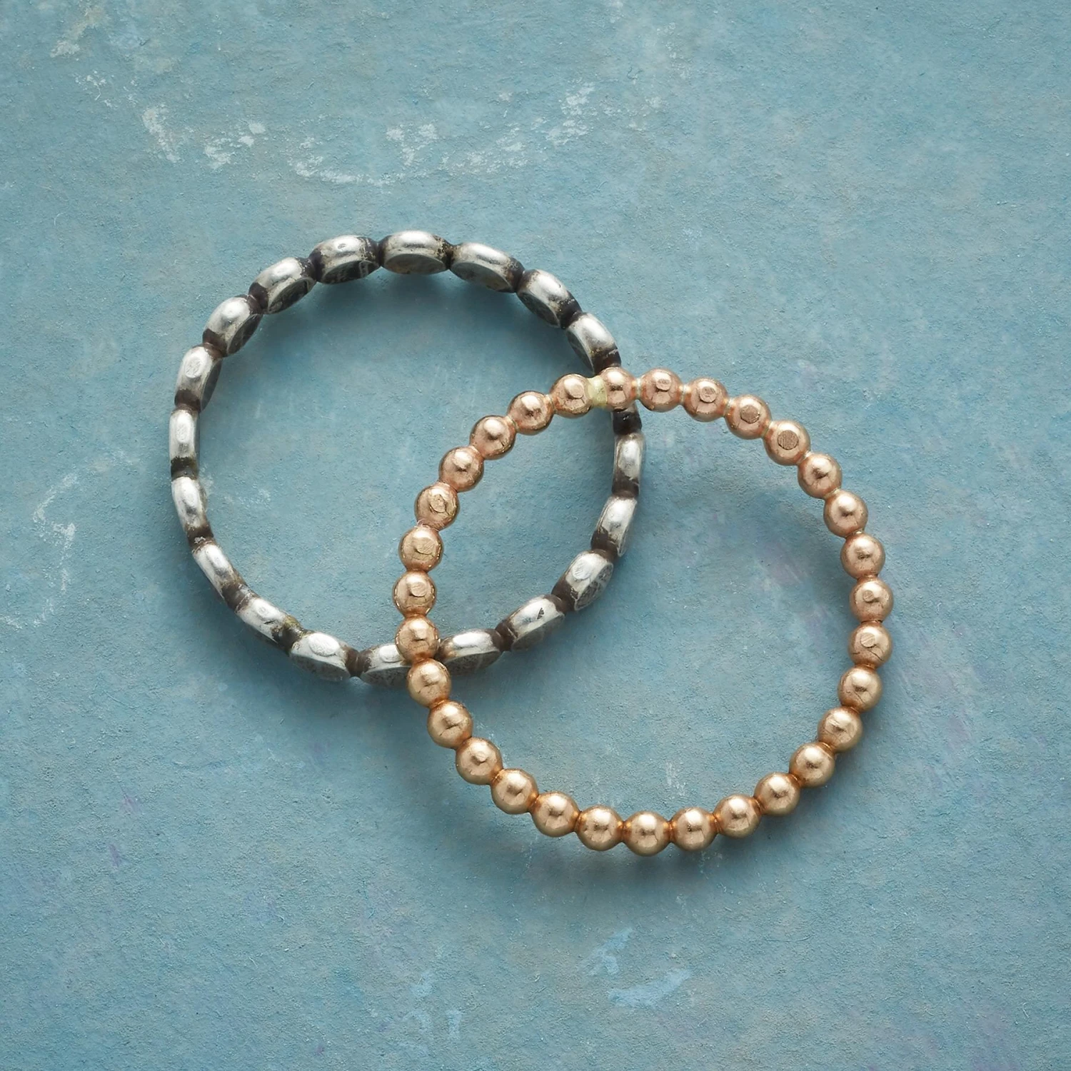 A ring of oxidized silver dots plus a beaded band of 14kt gold-filled add up to a sweet set to wear stacked or scattered, on their own or mixed with other rings. Handcrafted in USA. Exclusive. Whole sizes 5 to 9. Set of 2.
