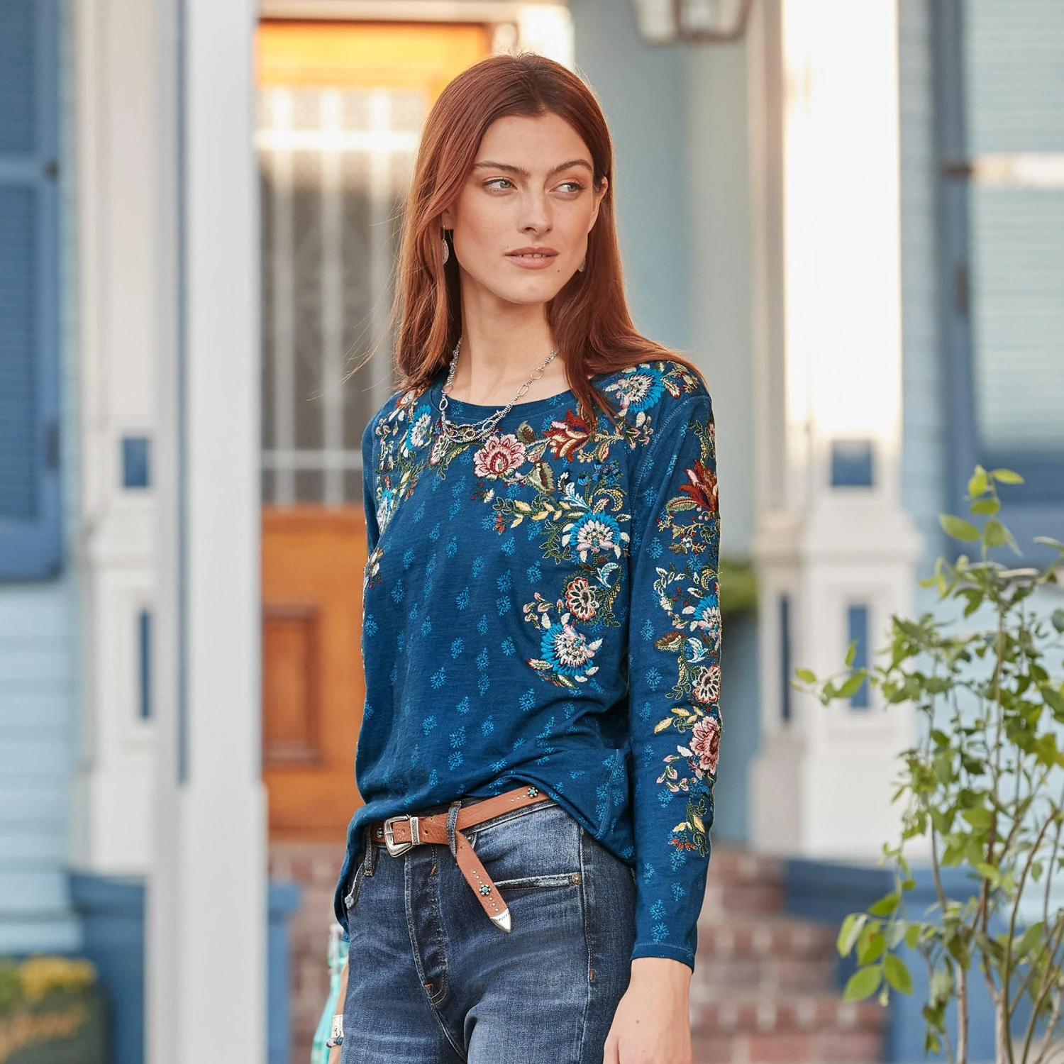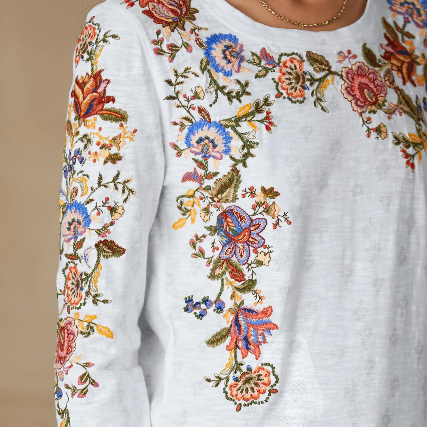 Our lovely, three-quarter sleeve tee with watermark printed flowers setting the backdrop for our lush embroidered florals. Stitching detail, twill tape trim. Cotton. Machine wash. Imported. Exclusive. Sizes XXS (00), XS (0â2), S (4â6), M (8â10), L (12â14), XL (16â18). Approx. 24″l.