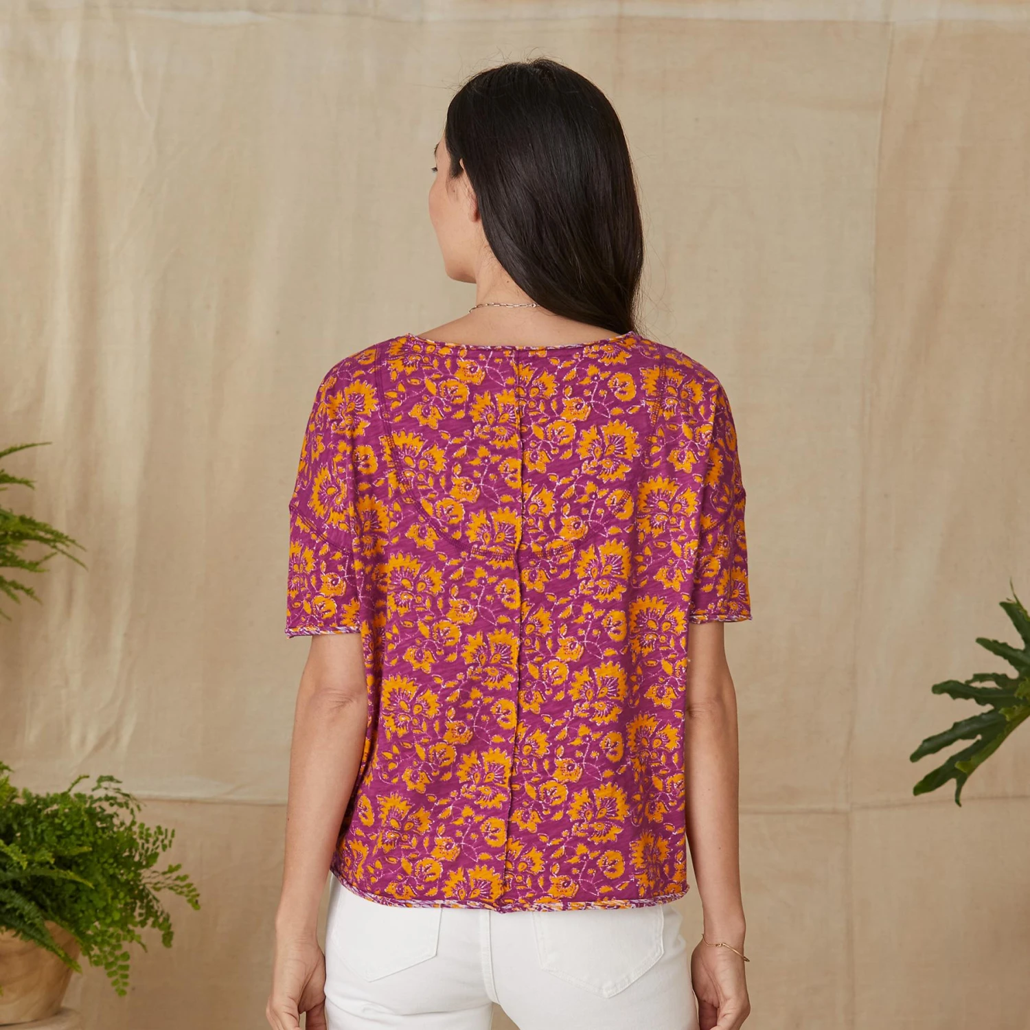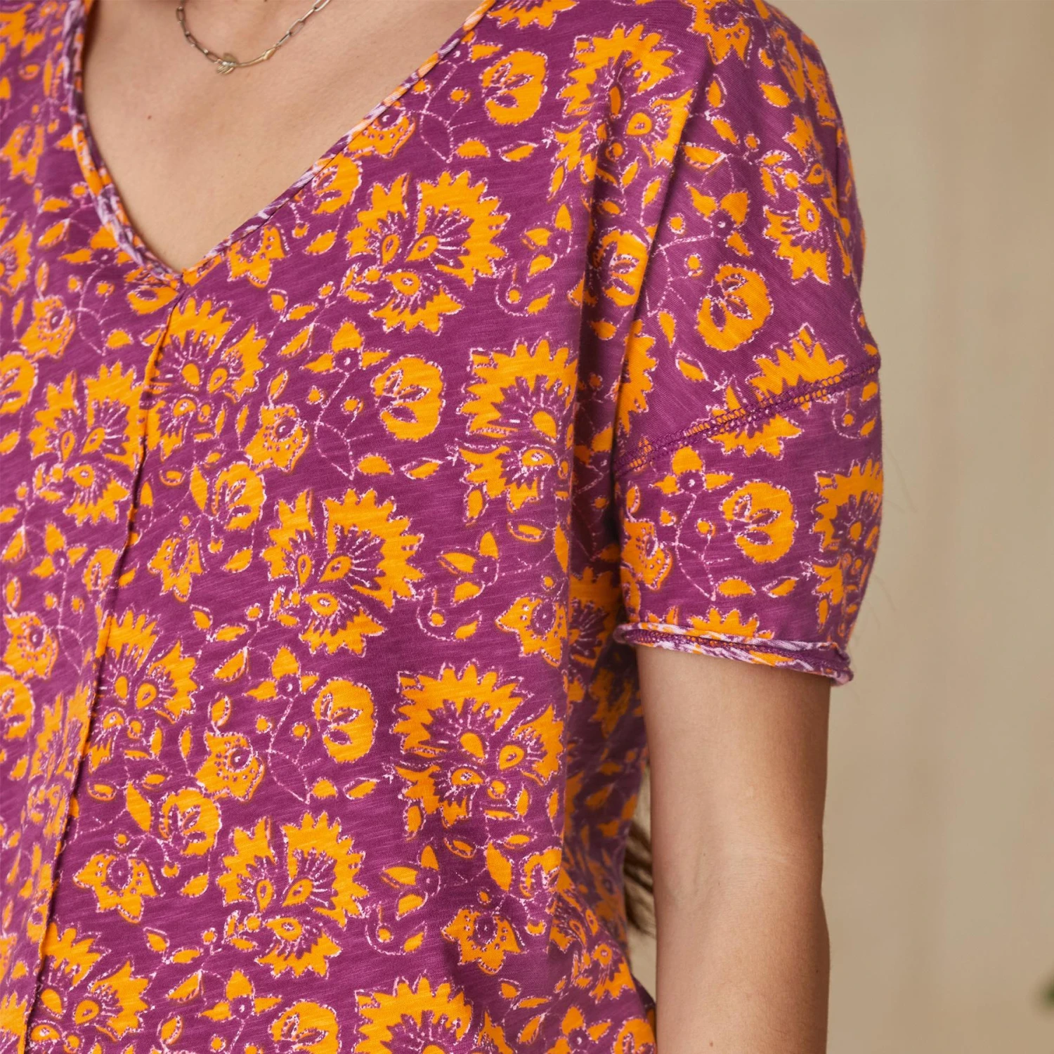 Our lightweight, rounded V-neck tee with rolled, raw-edge trim in a captivating wood block-inspired print. Relaxed, easy body has raw-edge seaming at center front. Cotton slub. Machine wash. Imported. Exclusive. Sizes XXS (00), XS (0 to 2), S (4 to 6), M (8 to 10), L (12 to 14), XL (16 to 18). Approx. 22-1/4″L.