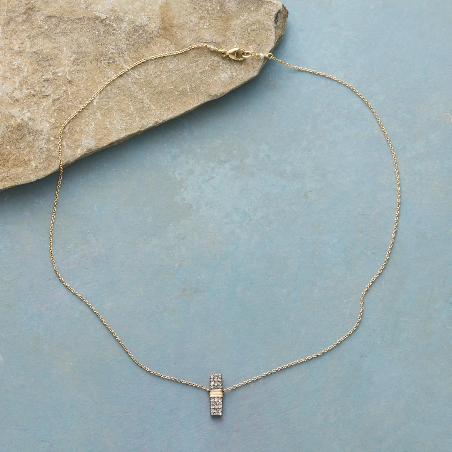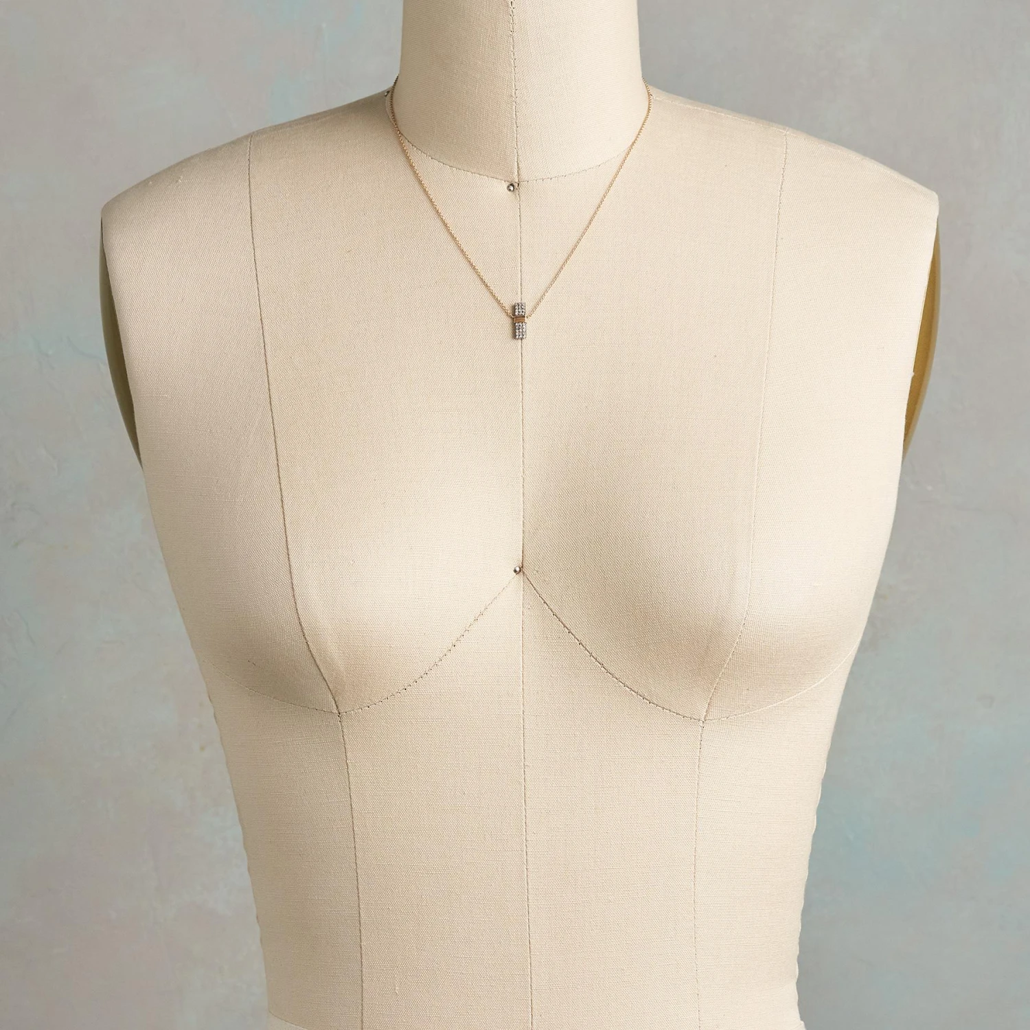 Wrapped gold wire bisects two glittering rectangles of pavé diamonds set in sterling silver. 14kt gold chain; lobster clasp. Designed by Dana Kellin and handmade in USA. 16″l, 1/2″ drop.
