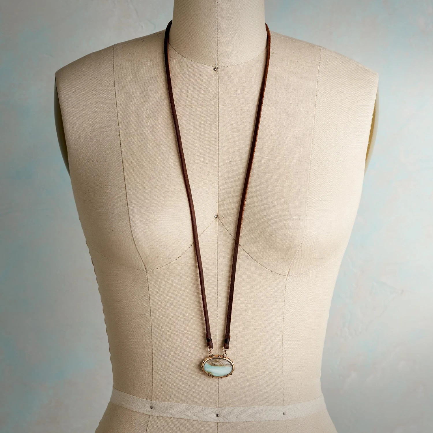 Peruvian opal’s varied hues remind Jes MaHarry of walks in the wilderness….each gem’s unique pattern a different journey. 14kt gold bezel; leather laces with sterling silver slider. Handmade in USA. Exclusive. Adjustable to 36″L, 1″ drop.